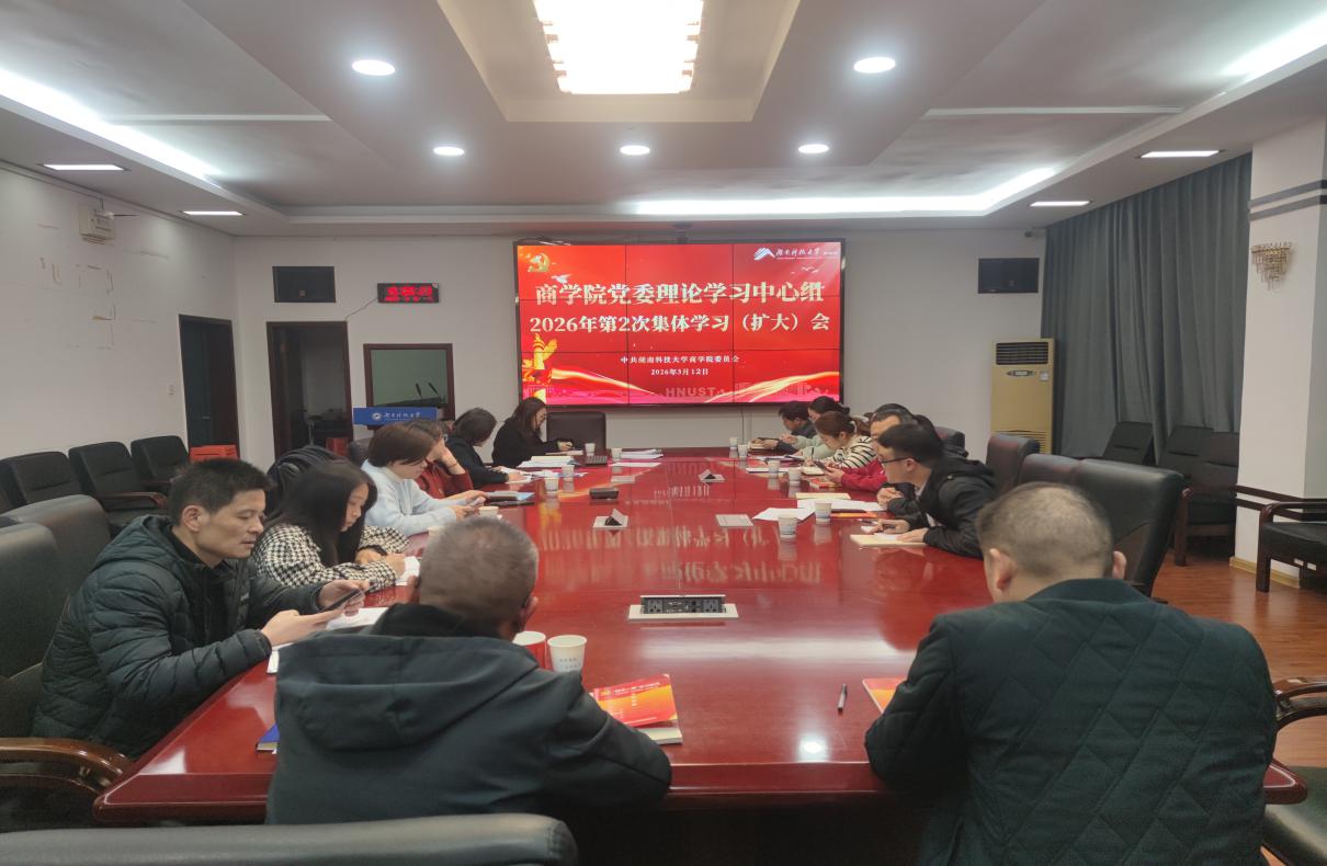 3月12日上午,商学院党委理论学习中心组在三教301会议室举行2026年第二次集体学习(扩大)会议。院党委书记叶文忠主持会议并讲话,全体院领导、中心组成员及师生党支部书记参加学习。
