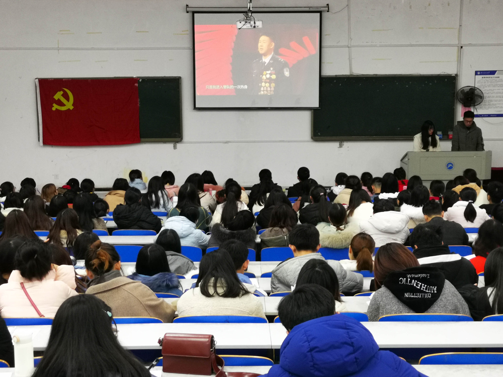 会议开始,全体党员观看学习了十九届四中全会精神的视频,在座党员对十九届四中全会精神有了基本了解,也充分感受到了改革所带来的幸福感、获得感、安全感。紧接着,全体党员学习主题教育先进典型事迹,保家卫国的特警孙建国和无私奉献的老教师龚全珍让在新时代长征路上的学生党员们更加振奋,他们的精神对在座的党员进行了一次思想洗礼。