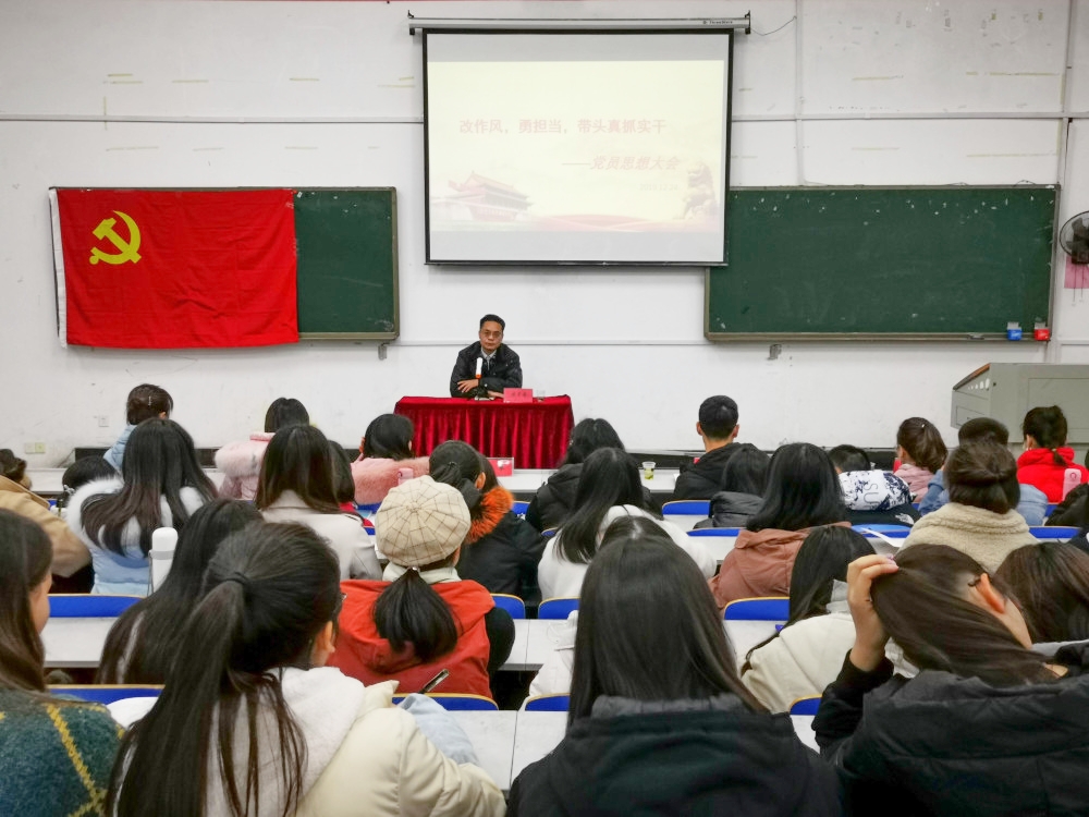 2019年12月24日下午16:00,商学院在一教204教室组织召开以“改作风,勇担当,带头真抓实干”为主题的党员思想教育大会。与会人员包括商学院党委副书记傅早霞、各辅导员老师以及全体学生党员。