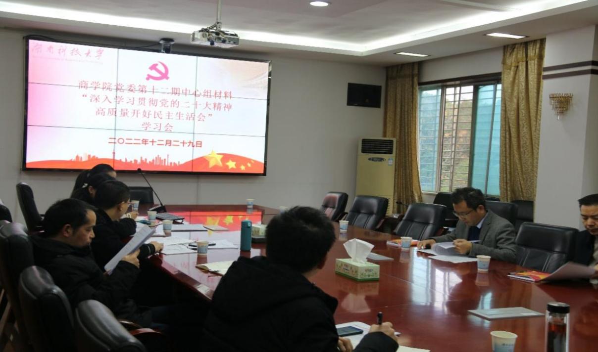 2022年12月29日上午,商学院党委理论学习中心组在三教301会议室举行“深入学习贯彻党的二十大精神 高质量开好民主生活会”专题集中学习,商学院党委理论学习中心组全体成员参加学习。