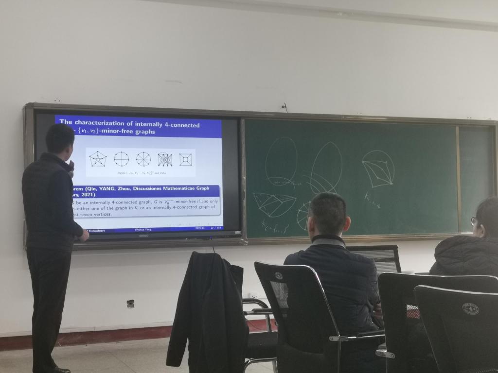 11月20日,太原理工大学数学学院副院长、博士生导师杨卫华教授应我院数学学科图论方向邀请作了题为“Several partial works on graphs without some special 2-connected graphs as a minor”的学术报告。相关方向的老师及研究生到场聆听。