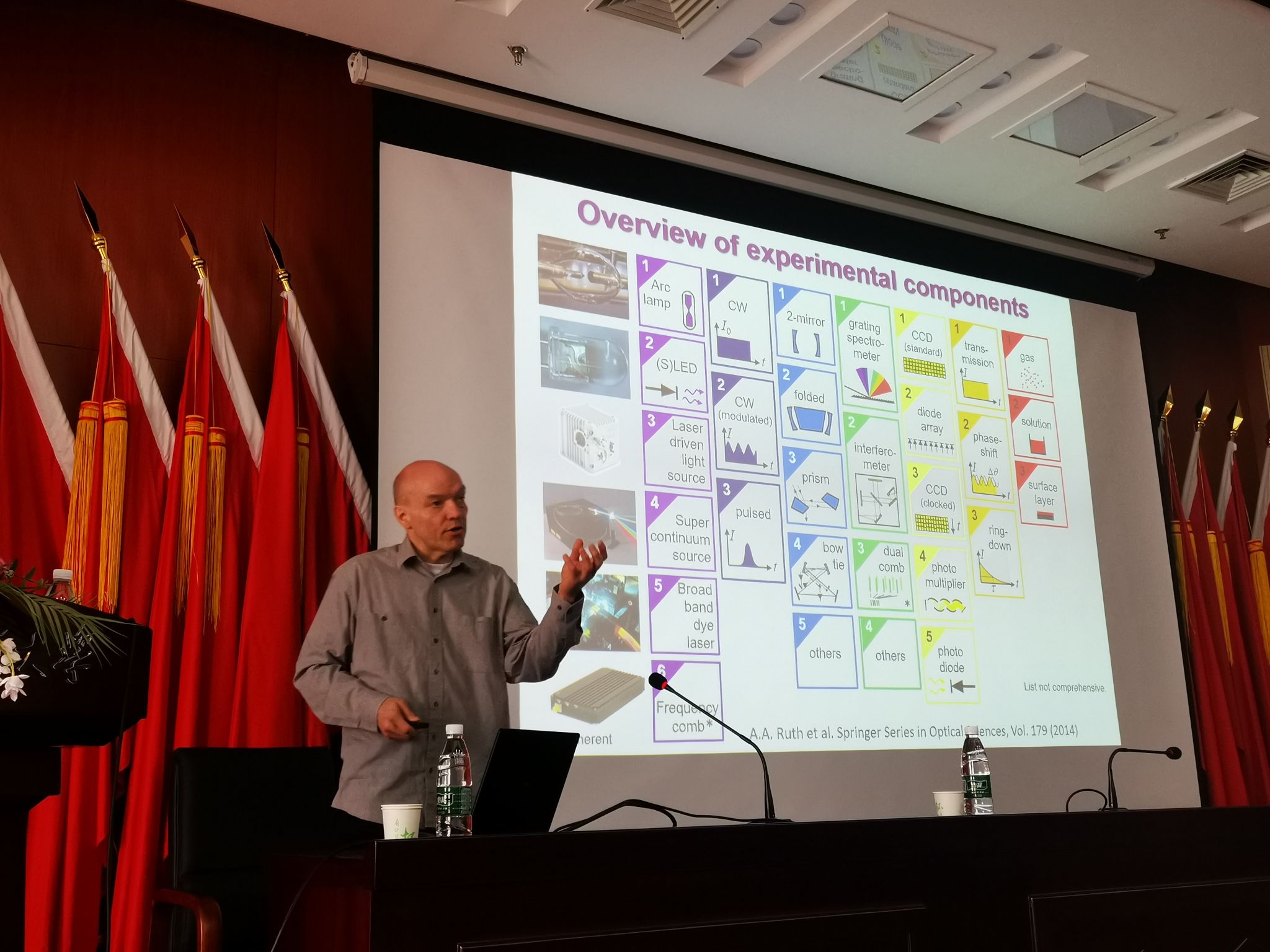 Fittsche教授从事与化学动力学、光谱学、过氧自由基的研究。其报告题目为《Reactivity of Peroxy Radicals studied by Laser photolysis - Cavity Ring Down Spectroscopy》。报告从腔衰荡激光光谱技术(CRDS)的原理入手,讲述了OH、CH3C(O)O2及HO2自由基的制备过程并结合CRDS技术实现了自由基的测量。