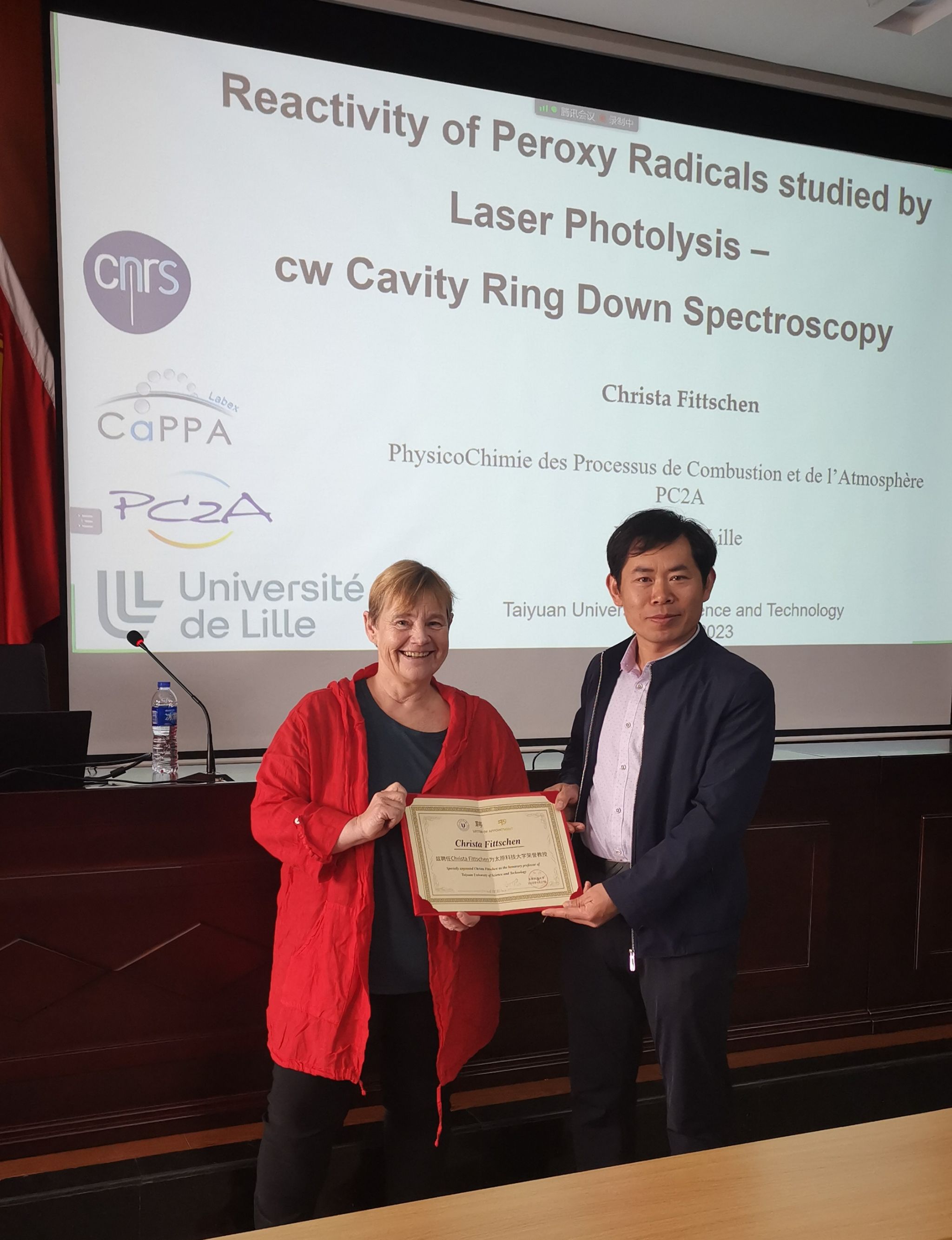 2023年4月27日,法国国家科学研究中心和里尔大学“燃烧过程和大气的物理化学实验室(PC2A)”的研究主任Christa Fittschen教授和爱尔兰科克大学化学研究中心Andy Ruth教授应邀在图书馆六楼作了两场精彩学术报告。报告会由太原科技大学党委宣传部、科学技术研究院主办、应用科学学院承办,光学工程学科教师及研究生聆听了报告会。应用科学学院李传亮教授主持了本次学术报告。