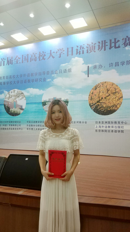 9月23日首届全国高校大学日语演讲比赛在河南许昌学院举行,我校商学院15级旅游管理专业赵勤同学荣获全国二等奖。