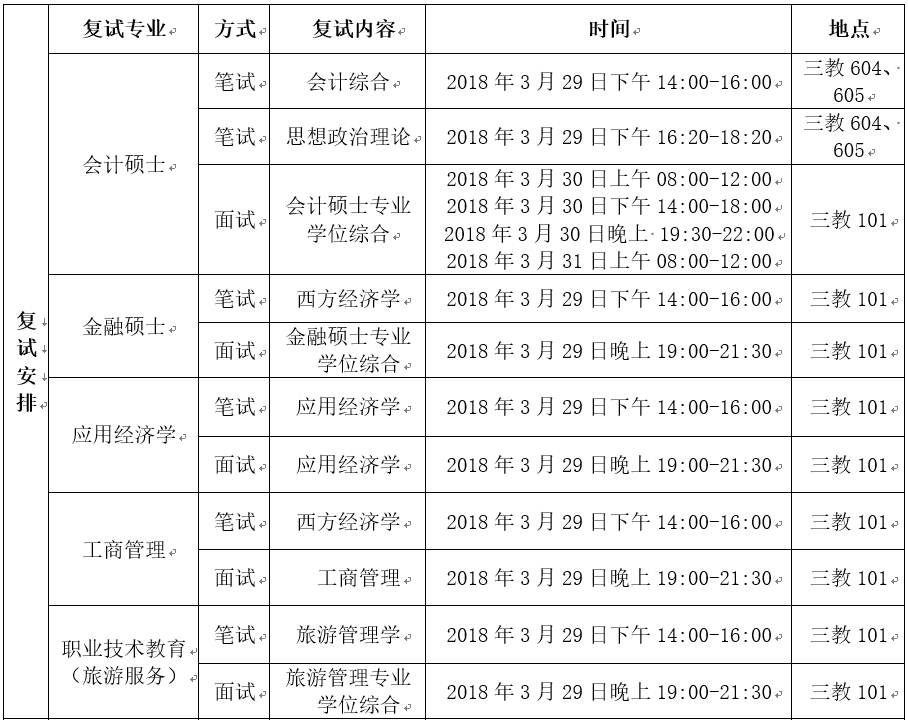 1、2018年3月29日9:00-12:00办理报到和资格审查手续,地点:湖南科技大学综合办公楼主楼一楼。办完报到和资格审查手续后,请到第三教学楼(商学院)一楼101室进行确认并上交复试情况登记表。