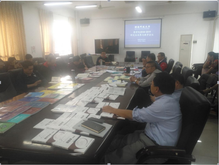 商学院副院长颜剩勇教授带领导师们学习了《湖南省全面落实研究生导师立德树人职责的实施细则》、《湖南科技大学硕士研究生指导教师管理办法》和商学院研究生导师招生资格确定细则等文件,传达了最新的研究生培养与教学的政策动态,分析了研究生培养与教学的现状,并对培养方案的修订做了具体要求。