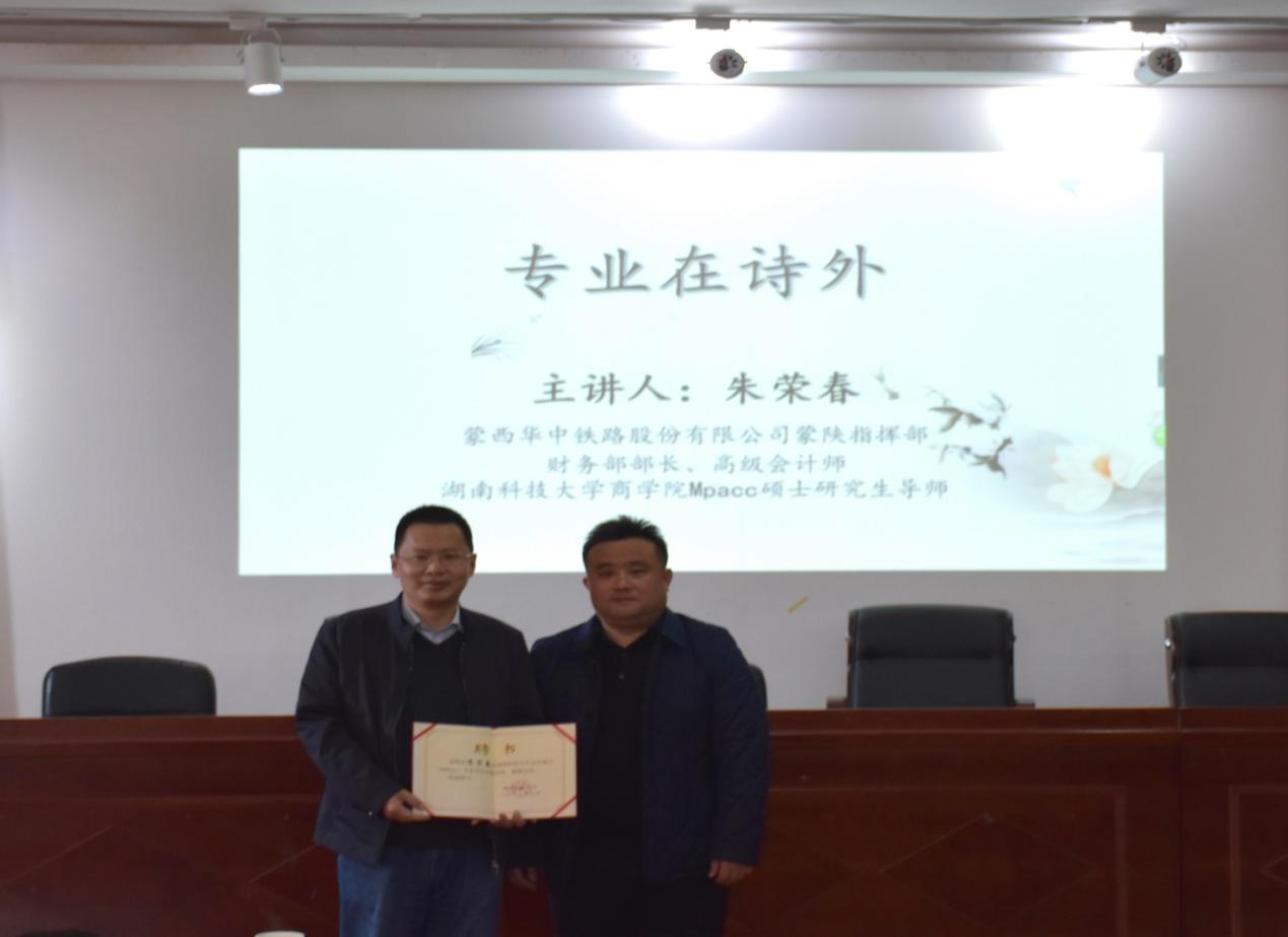 讲座分为三个部分。第一部分,由潘爱民书记代表商学院,向朱蒙春先生授予湖南科技大学商学院MPAcc硕士研究生导师的聘书。