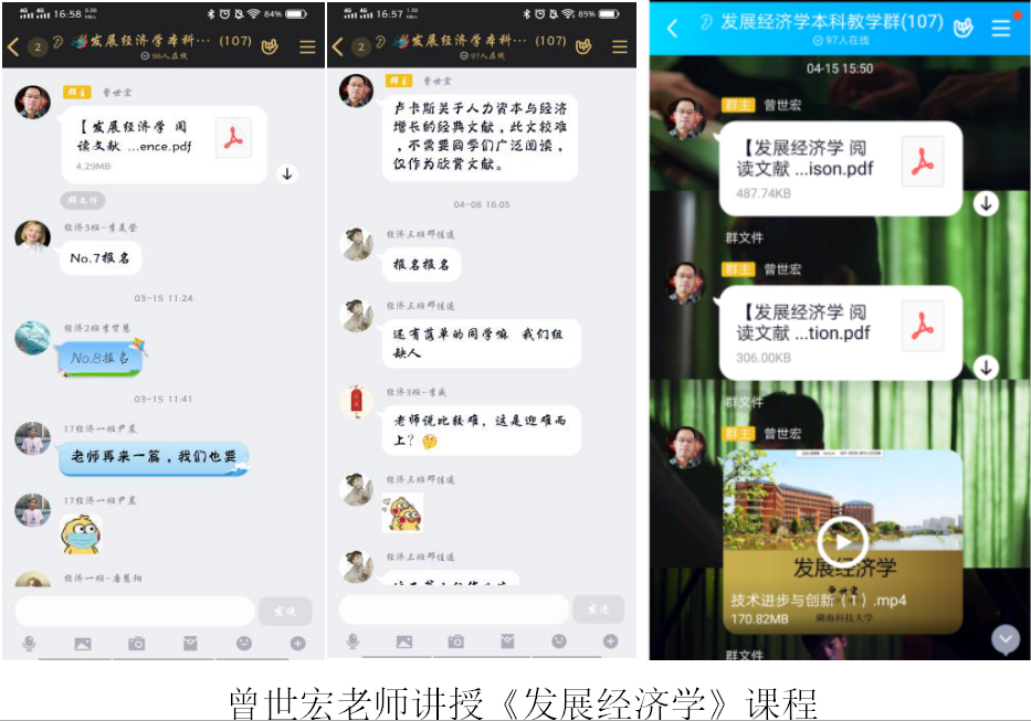 曾世宏老师的《发展经济学》课程在教学过程中发布大量课程相关学习材料,供学生自由吸收,提高学生汲取知识的积极性。公开课教学充分利用线上云课堂教学交互性优势,与学生产生高效良性互动,在屏幕前及时解决学生的问题。教学采取直播与录播结合的方式,学生可以通过回放来补充修改笔记进行二次学习或复习,有助于学生进行自主选择性学习。曾老师还适时在群里分享相关文献供同学们交流学习,拓展学生的学术视野。