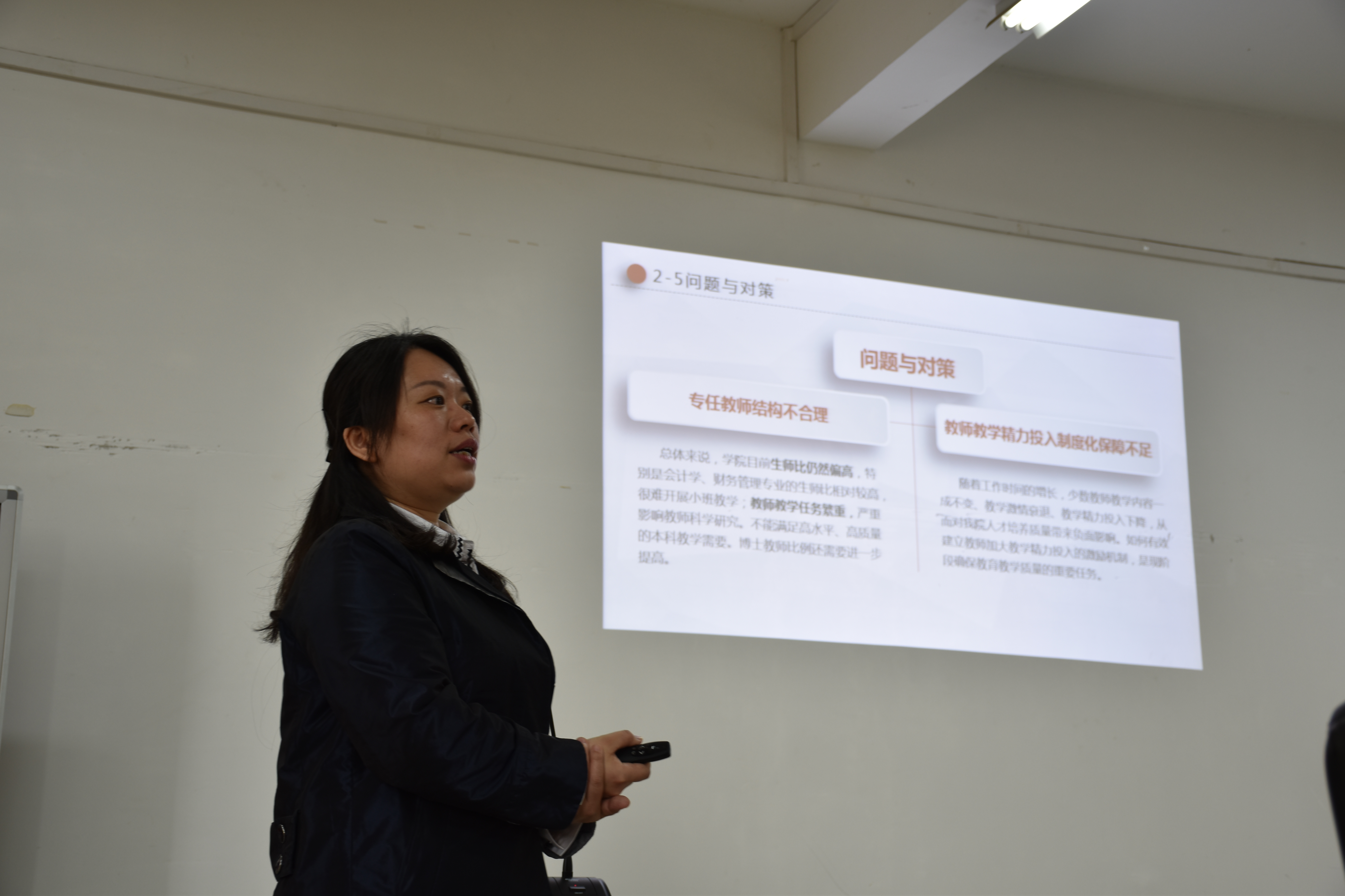 首先,仇怡对我院本科教学审核评估工作进行了工作汇报。在我院自评自建工作开展过程中,全院上下高度重视,制定整改计划,落实整改任务。积极查找目前学校教学及教学管理工作中存在的问题,有机结合自我建设和自我评估,在学院范围内建立起自下而上和自上而下的双向交流和评价机制。并对我院自评自建工作中存在的问题及改进措施进行了重点汇报。对于学院的办学定位与发展规划,她指出商学院的办学定位是突出以“应用”为目标,以“创新”为特征,注重过程与质量相统一、规范与特色相结合,坚持把创新型应用人才教育贯穿于本科学生培养全过程,实行经管融合,以大经管人才观,培养具有国际视野和企业家精神的创新型应用人才。根据人才社会需求优化课程体系,提升实践教学条件,扩展专业教学资源。在教师队伍的建设方面,她强调要关注青年教师成长,提高教师教研教改水平。