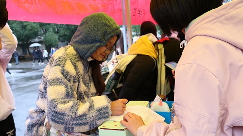 在活动正式开始前,心健部的成员们早已经搭好了帐篷,挂好了横幅,摆好了桌椅,备好了奖品,只待同学们来参加游戏。这次摆点活动主要设置了三个游戏项目:你说我猜、心灵手巧和语言陷阱。在活动前一周的宣传预热后,已经有不少同学通过QQ空间集赞等渠道知悉了这次活动,满怀期待地来到这里兑换奖品。到了用餐时间,美食广场渐渐热闹起来,人来人往,络绎不绝。参加活动的同学们也随之增多,他们丝毫不因阴雨绵绵、寒风凛冽消退活动的热情。现场摆点活动开展得如火如荼。