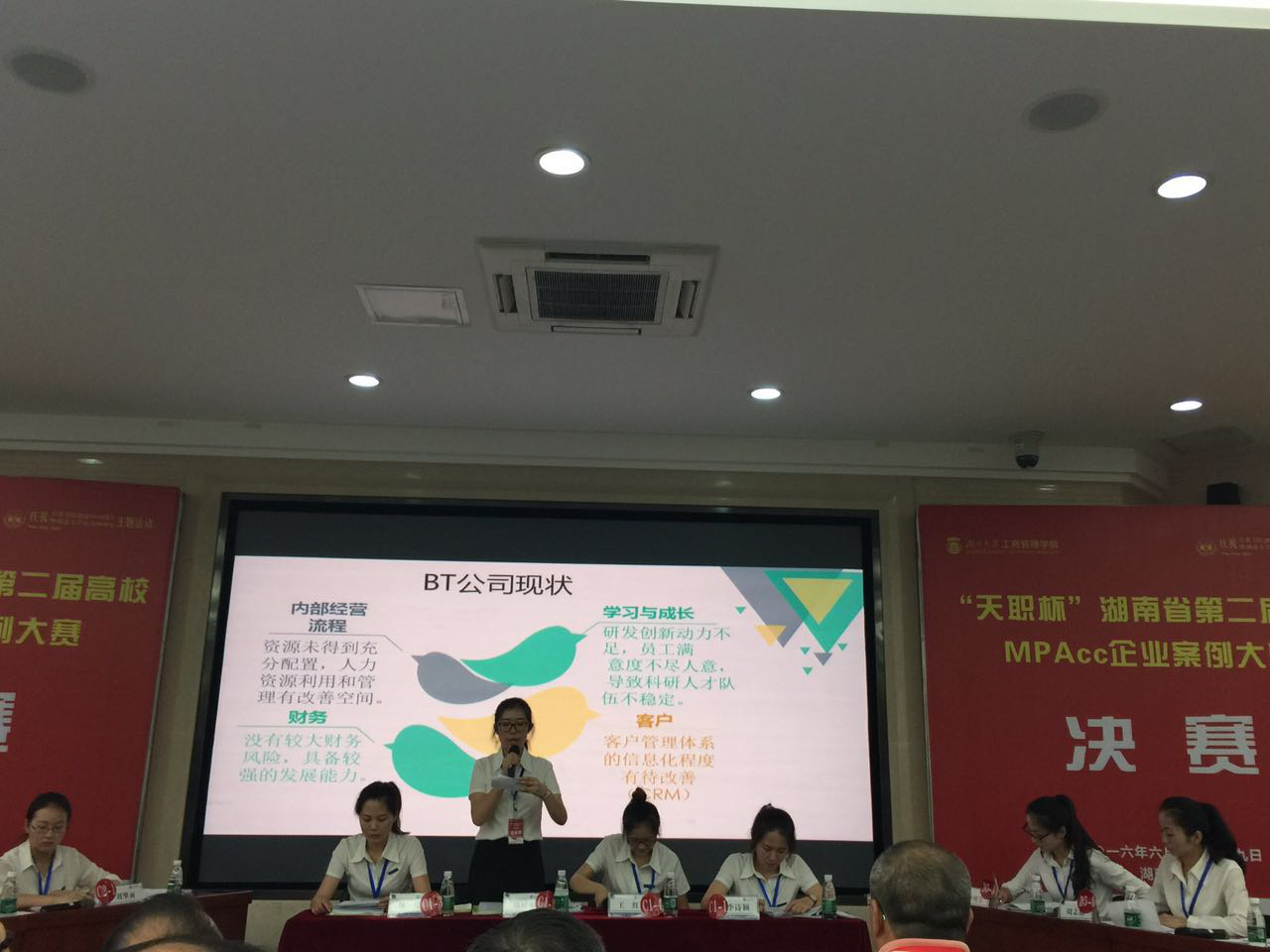 6月18日至19日,“天职杯”湖南省第二届高校MPAcc企业案例大赛在湖南大学工商管理学院顺利举行。全省共有91个队参赛,初赛第一轮比赛胜出30支队伍,我校占5支。初赛第二轮胜出12支队伍,我校占3支。湖南大学、湖南科技大学、湖南师范大学、南华大学、湘潭大学、长沙理工大学、湖南商学院等7所学校的12支队伍参加了复赛。经过激烈的角逐,湖南大学超能队、湖南师范大学sunny winner队、长沙理工大学长理集结号、南华大学Archers队、湖南商学院南波万队以及我校Dreamers队顺利挺进决赛阶段。