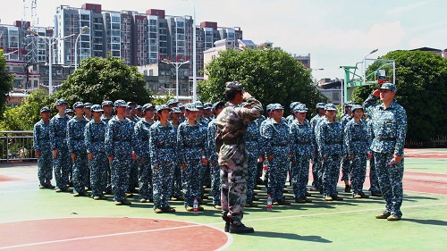 尽管汗水将迷彩服浸湿,同学们依旧保持挺胸抬头,没有丝毫懈怠。在一声声铿锵有力的口号下,同学们一丝不苟地完成了立正稍息、向右看齐、跨立转向、下蹲、起立等训练任务。经过一个上午的训练,同学们便能根据动作指令的发出做出迅速、正确且标准的反应。