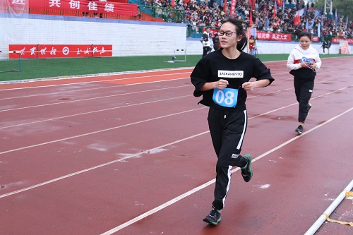16:24,女子5000米比赛开始,这是一番耐力与毅力的比拼,每一位“女将”都是巾帼不让须眉,咬紧着牙关挑战着自我,最终商学院田欣以25′22″28的成绩斩获头名。田欣说:“没有想过会拿第一。在比赛开始前,我有着前所未有的紧张,因为我的目标,是领奖台。只要有人在我前面,我就努力去追,虽然很累,但看到学院书记,我的志愿者,我的同学们,都在为我加油,我便充满了动力。”商学院同样参赛的彭雅凡虽未取得靠前的名次,但她在最后精疲力尽时,仍然完成了冲刺,她说:“哪怕落后,只要一直奔跑,我就永远都不会输”。