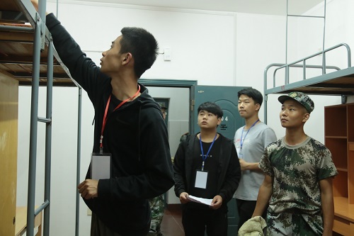 10月4日晚19:20,新生寝室迎来了他们的第一批“客人”――他们敬爱的教官。“教官好”,女生寝室新生分列两边礼貌地向教官问好。看到他们一副惶恐的样子,一营一连一排长教官吴锋龙笑道:“不用那么紧张,都放轻松,来个人跟着我,记下打扫卫生时候需要注意的地方。”吴锋龙细心地检查并指点了那些容易被忽略的角落,并对部分寝室的“豆腐块”提出了表扬:“可以啊,这棱角都出来了,很不错。”男生寝室里十二排排长吕新斌还亲自示范了“豆腐块”的叠法。