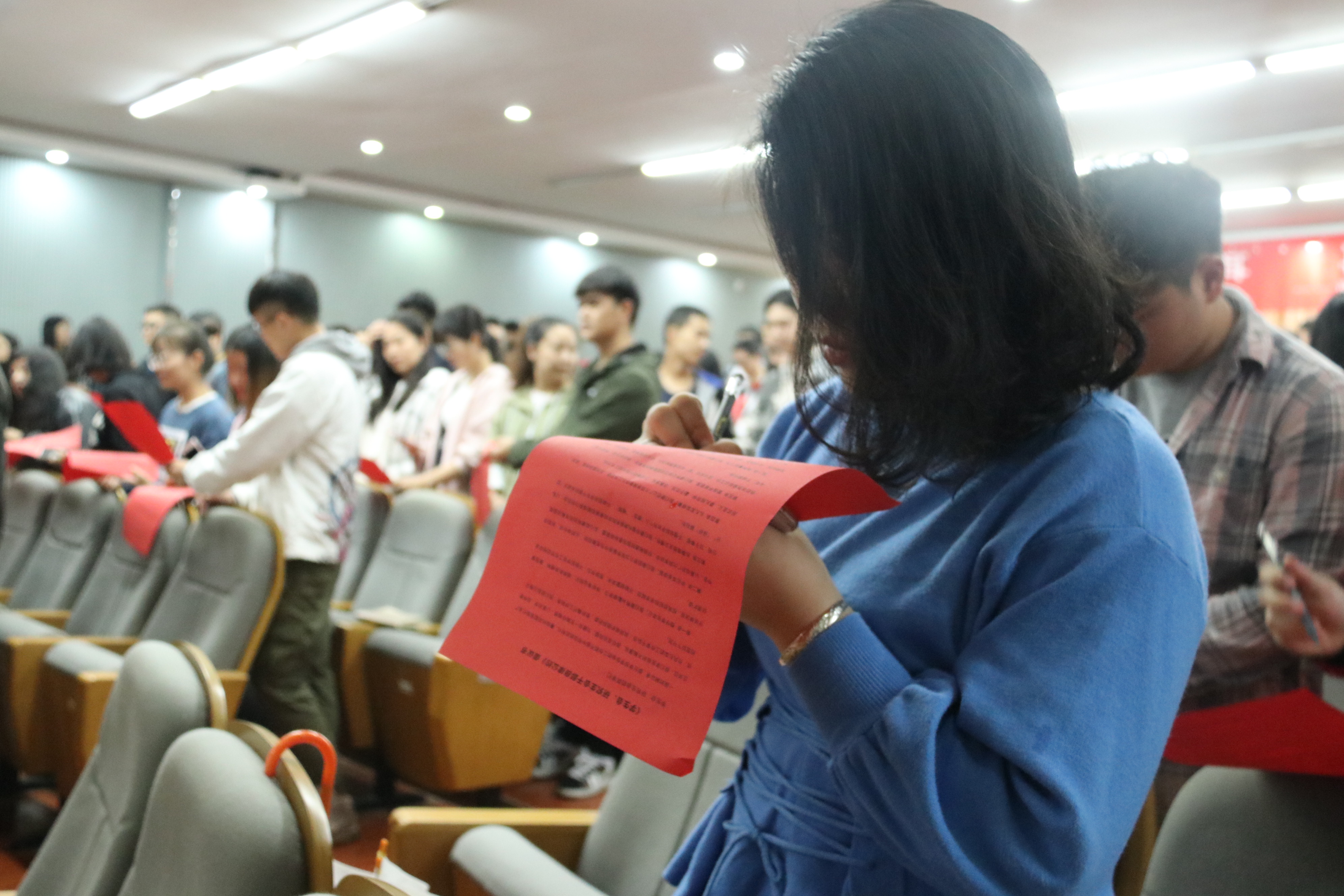 随后,翟广达带领在场所有学生干部逐条阅读《学生会、研究生会学生干部自律公约》,要求学生干部严格遵守,时刻谨记并以此为戒,作为自己的处事原则。该公约得到了在场学生干部的广泛认同,大家纷纷在倡议书上签名。