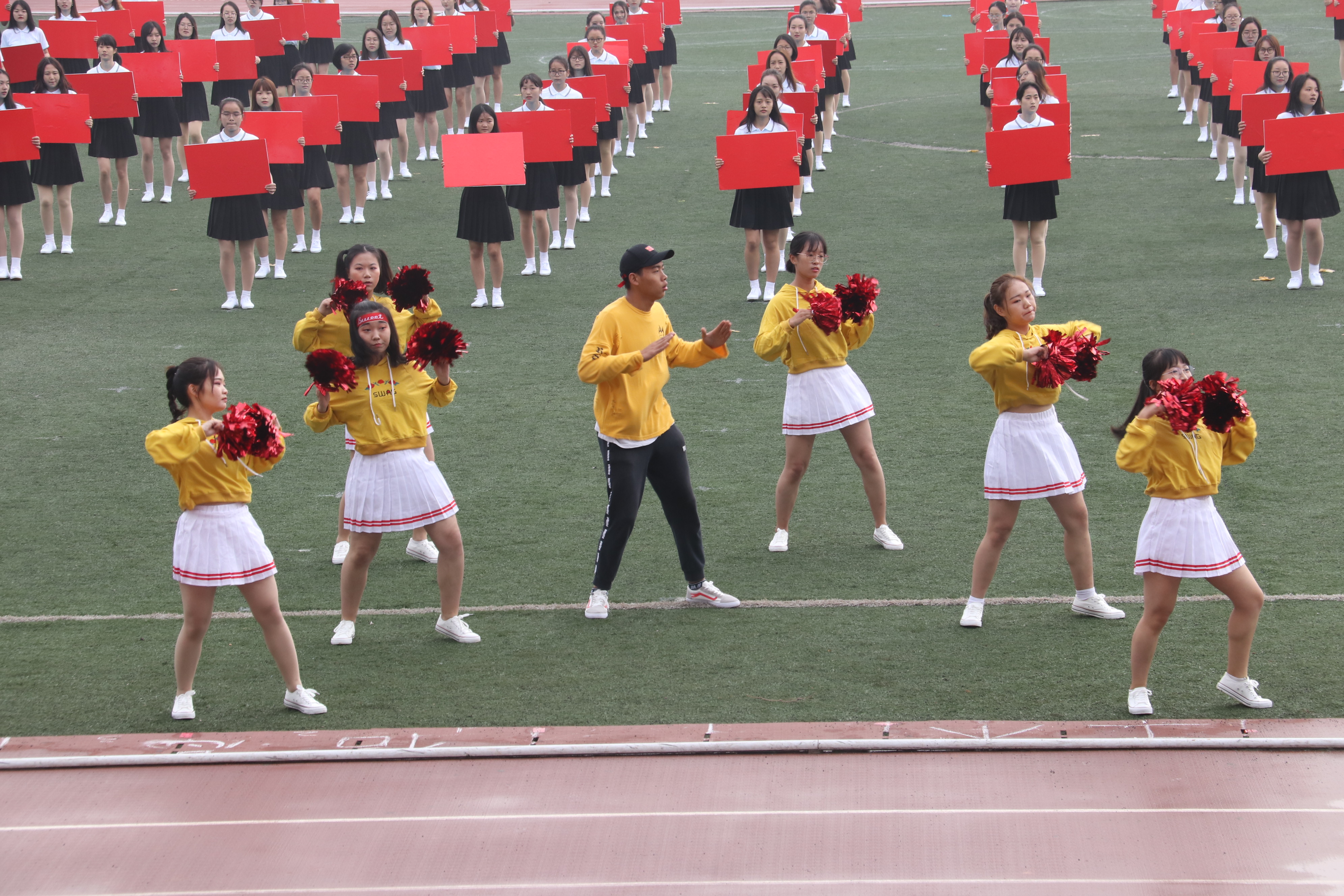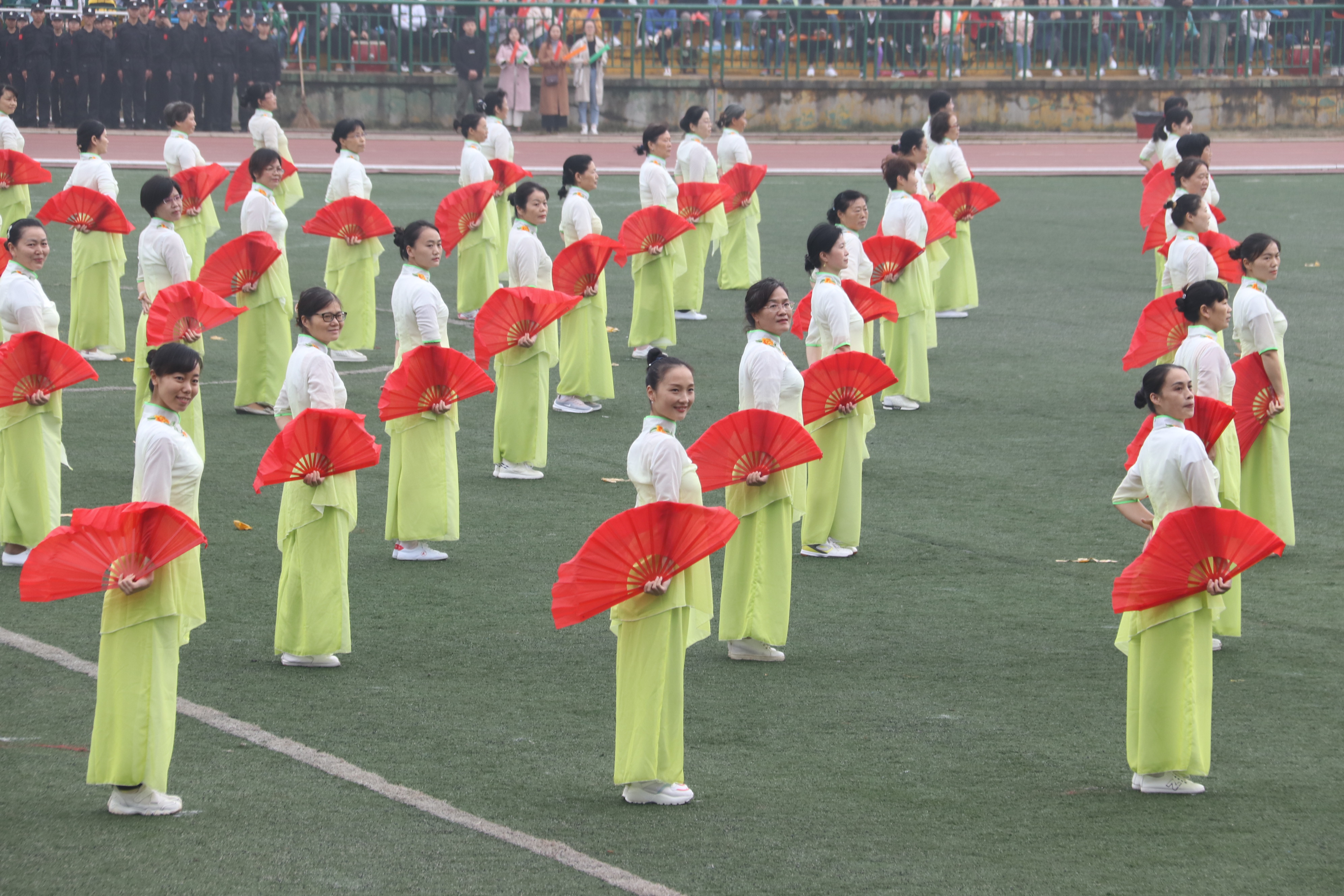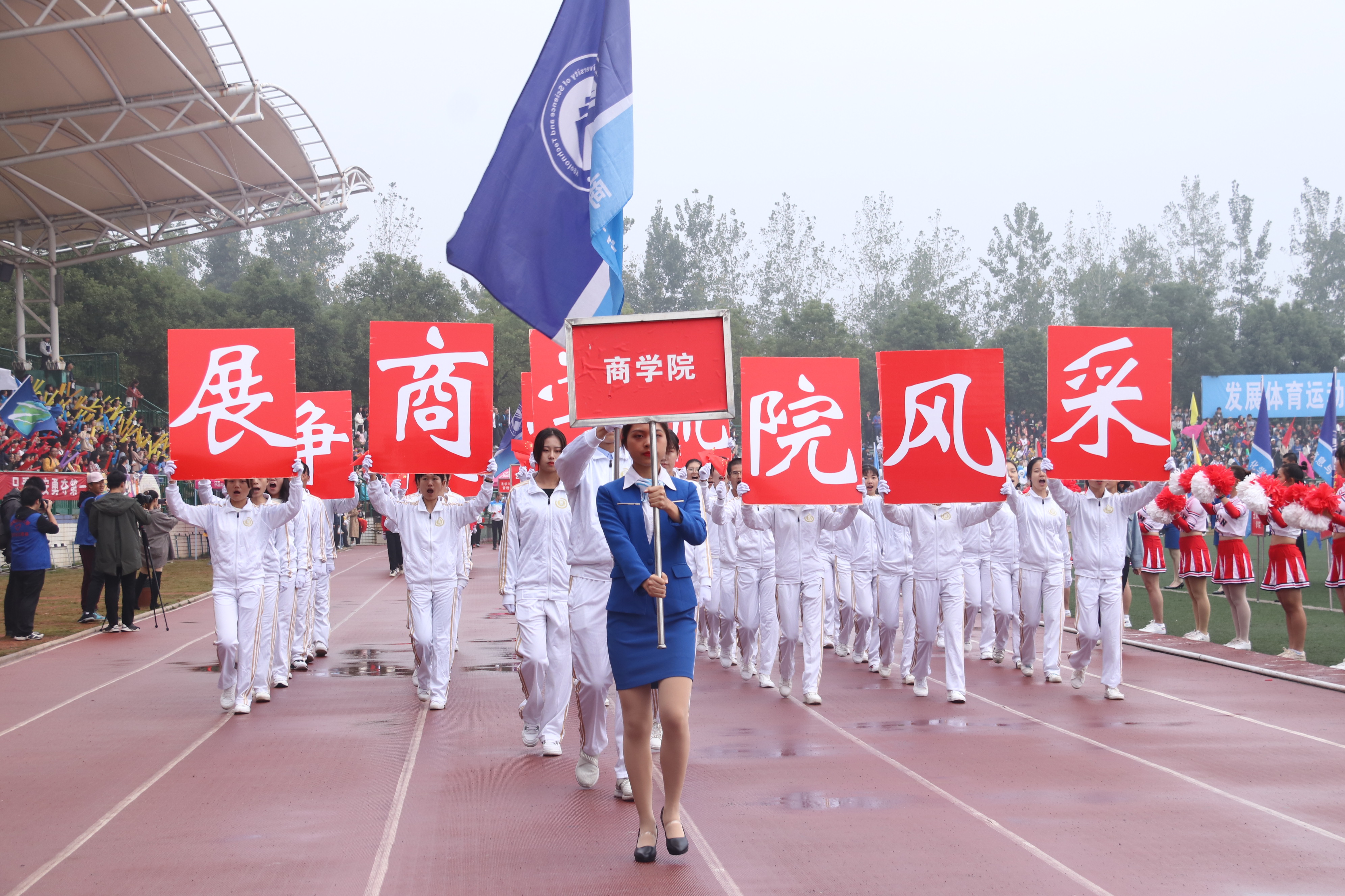 迎着朝露,和着激昂奋进的《运动员进行曲》,比赛裁判员方阵队,各学院方阵队,教职工方阵队依次经过主席台,进行检阅。他们抬头挺胸,步伐坚定。“激情飞扬,凌云赛场,商院独霸,问鼎科大。”气势磅礴的口号,展示着商院别样的风采。身穿白色运动服的商院娇子,手扬红旗,英姿飒爽。恰同学少年,意气风发,他们誓为商院争光。同为商院人,怎无商院梦?观众台上,欢呼雀跃,“呯、呯、咚咚咚……”加油声,鼓声响彻云霄,回荡不已。