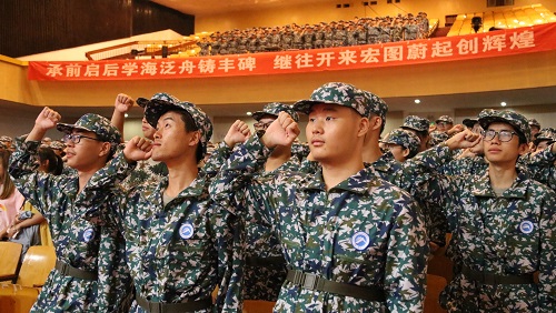 暮色沉沉,繁星点点。开学典礼结束后,20:30,又召开了军训动员大会。商学院学生会执行主席徐世通发言。他希望新生们通过此次军训锻炼体格和意志,并且在军训过程中,展示自己的风采。紧接着,军训教官们迈着整齐的步伐走进了会场。在军训团营长依次介绍各排教官后,新生代表袁海绪带领商学院全体新生宣誓,“我宣誓,一定服从命令……”。