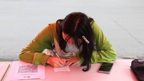 活动当天虽然阴云密布,细雨连绵,也未能阻挡志愿者们的热情,他们提前到达指定地点,有条不紊地进行活动准备。待活动正式开始,志愿者们便主动上前邀请路过的同学参加活动。同学们或被志愿者的热情所吸引,或对活动内容感兴趣而驻足,纷纷来到帐篷下详细了解活动内容。为了让大家知悉留守儿童的基本生活情况,志愿者引导大家阅读来自留守儿童的相关信件,同学们依据志愿者的指引,仔细阅读信件并在纸上写下了对留守儿童的真挚祝福。最后,同学们录制了为留守儿童发声的读信视频,以期让更多人了解留守儿童这一特殊群体。
