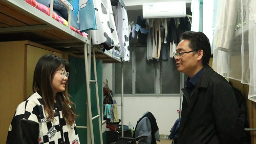 傅早霞就宿舍分布与作息时间等基本问题同主席团成员与宿管部部长进行了解后,便展开了本次下寝关怀活动。在下寝过程中,傅早霞副书记就学习、生活、大学规划等方面同学生们进行了详细交流,深度了解了学生们对大学生活的适应情况,并做出了相关建议。