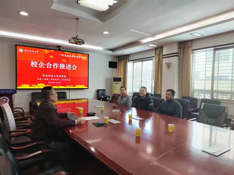 2024年1月25日上午,湖南科技大学商学院与湖南大道新材料有限公司“校企合作推进会”于第三教学楼301会议室顺利召开。大道新材董事长方向、董事长特别助理易蓝(孟加拉)、综合部部长彭潜,商学院国际贸易与金融工程系主任潘竟成、商学院学工办主任陈攀等出席。