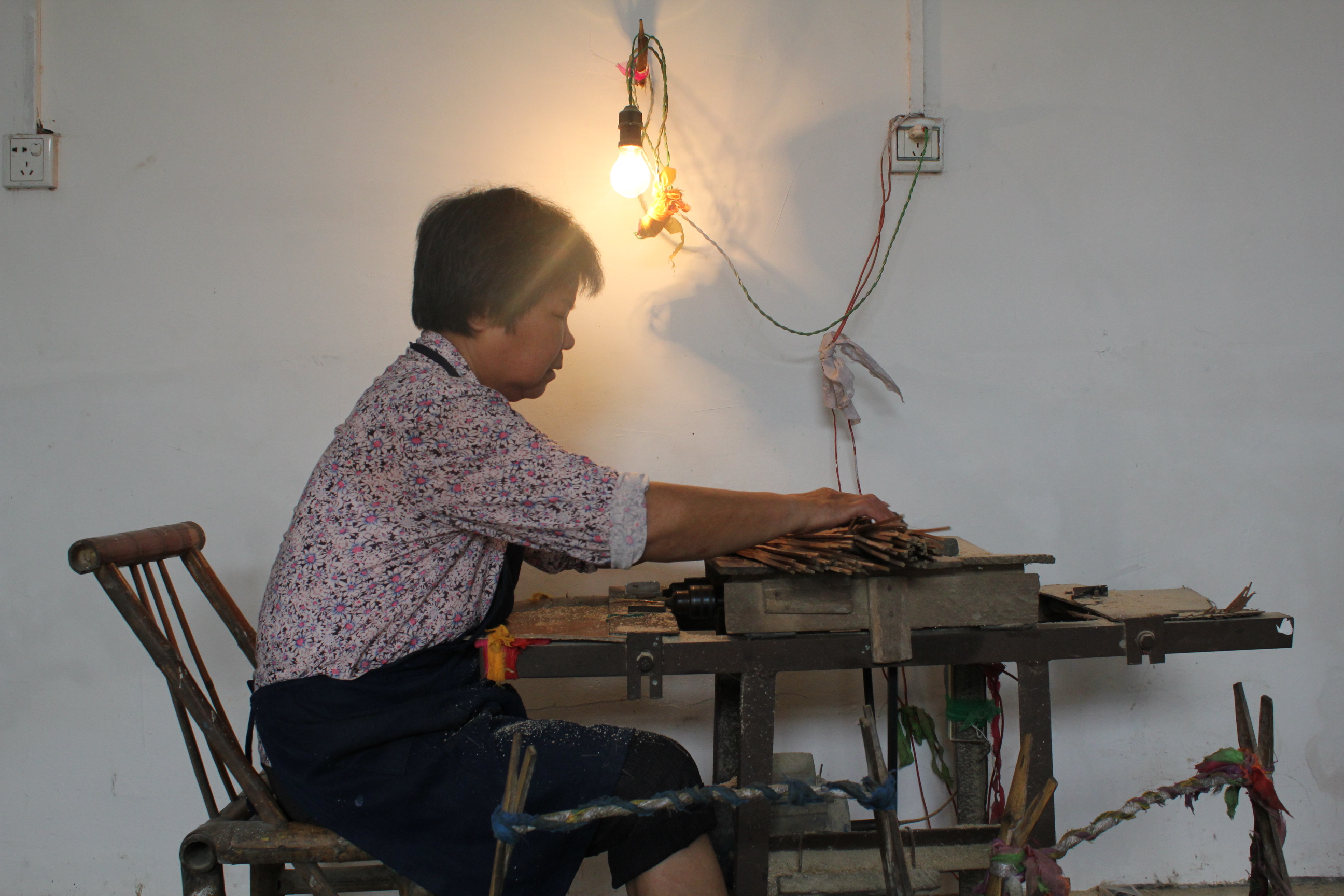 “屋后的竹子做伞骨,桐油也是桐树里采的,都是自然的。”周师傅指着一把刚上过桐油的伞,“我们用手艺加工。”敞亮的加工房里,被劈开的竹篾被用于做伞骨;一根约70公分的竹筒桩子立在地面上,竹内中空可将伞骨插入,供粘糊伞面之用;用两条竹条架空的竹竿子用以固定伞面;完成绘制后,将加工过的桐油涂在伞面上,有防腐、防蛀的功效。