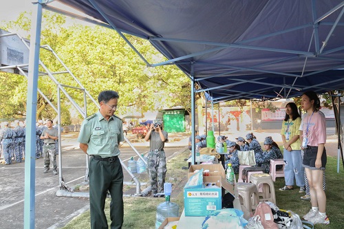 老师们先在休息区向伤病连的新生们展开了问候,了解他们的身体状况。老师们的问候传达了中秋佳节的温暖,让新生们倍感关怀。随后,老师们慰问了在休息区照顾伤病员的学生干部,干部们便向老师们介绍了休息区的基本情况。而武装部部长朱理哲注意到了休息区的物资十分齐全,他表示,商学院物资准备充分,将学生的身体健康放在心上。