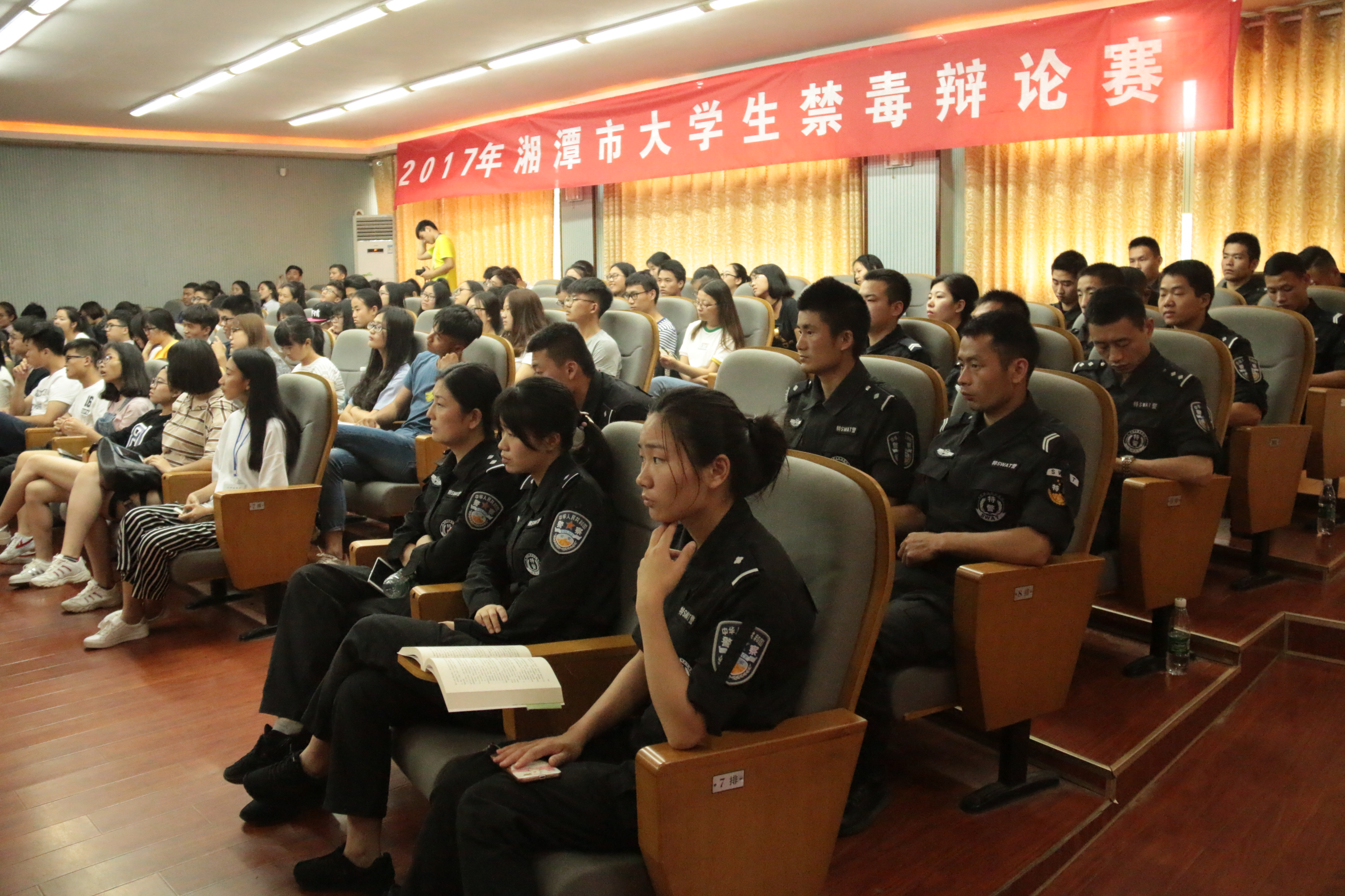 2017年5月3日15:00,湘潭市大学生禁毒辩论赛在我校第三教学楼101学术报告厅举行。本次比赛由湘潭市公安局、共青团湘潭市委、湘潭市妇女联合会、湘潭市禁毒委员会办公室主办,湘潭大学校团委、湖南科技大学校团委协办,湖南科技大学商学院承办。市禁毒委副主任兼办公室主任、市公安局党委副书记、副局长杨笠新,共青团湘潭市委副书记谢晖等八位领导莅临现场观赛。湖南科技大学商学院教授向志国、湘潭大学法学院博士生导师刘友华、湘潭电视台著名主持人马萍、湘潭市妇联权益部部长颜宇霆、湘潭市教育局黄慧五人担任比赛评委。