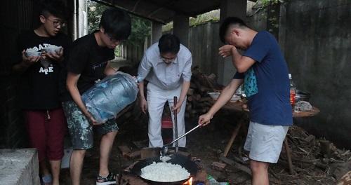 傅早霞看到学生自己生火做饭,表扬大家齐心协力、勤奋独立的精神,并亲自上阵秀了一把厨艺。接着又认真查看了学生工作和生活的环境,并了解同学们的适应情况,他告诫大家虽然条件艰苦,但仍要发扬艰苦奋斗精神。随后仔细询问了学生实践活动的情况,对接下来的科学调研工作和志愿服务工作进行了详细了解和指导工作。在慰问过程中,傅早霞回忆起自己那个年代三下乡的体验,“那时恰逢洪水过后,帮助村民修电器,临走时村民很舍不得,还希望我们志愿者再留下来半个月,”他感慨:“我们那时候下乡是真的下乡啊,下到农村去!”同时,他也对同学们吃苦耐劳、服务社会的品质给予了充分的肯定。