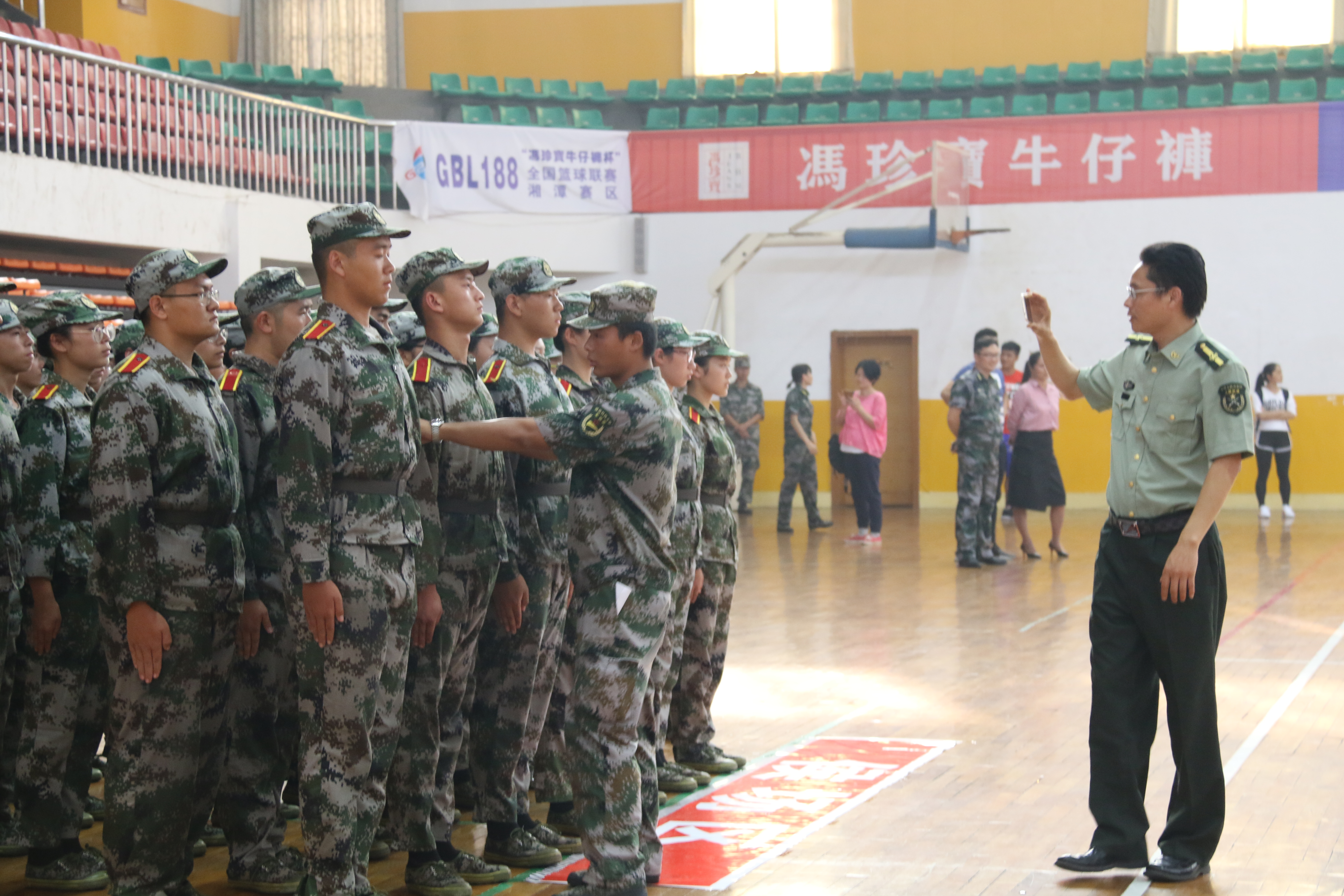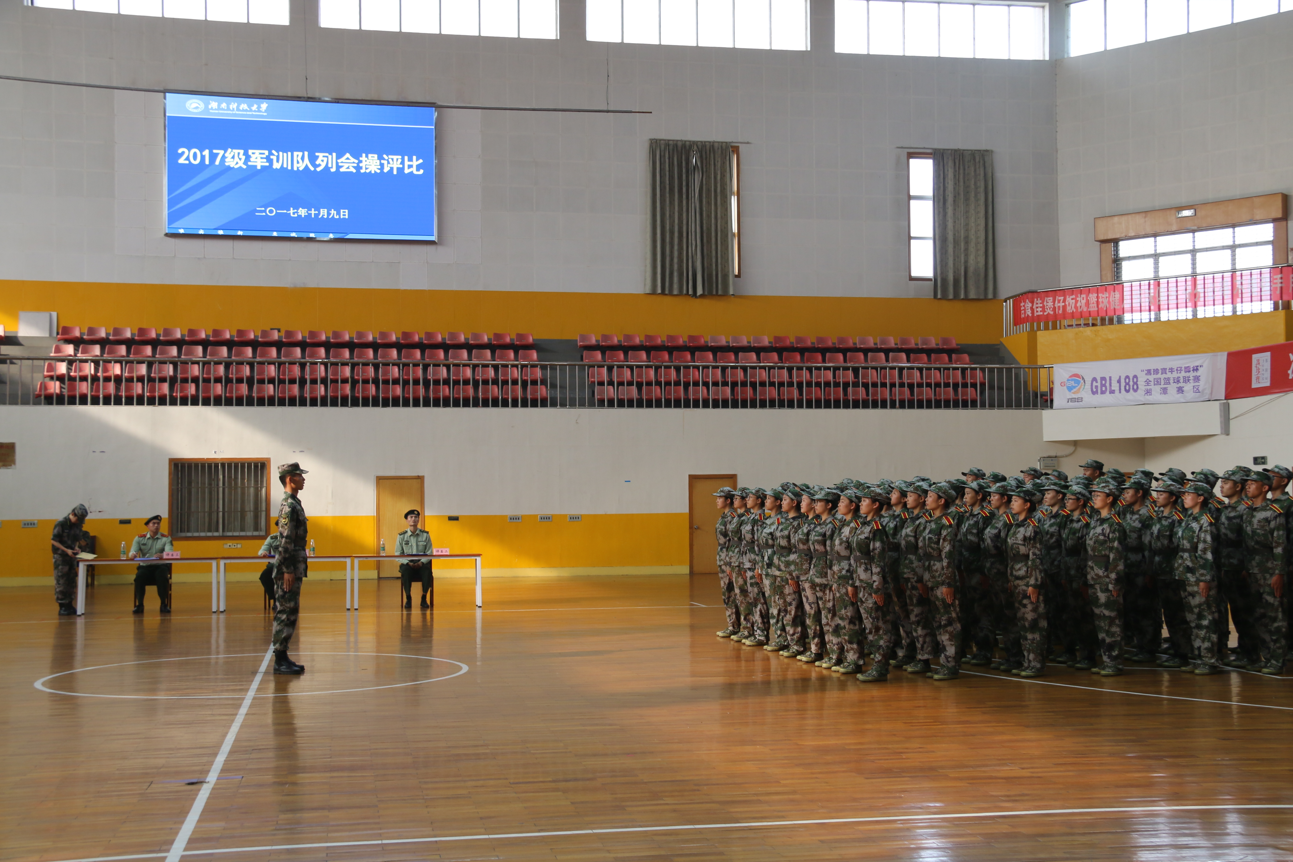 为检验军训效果,展示新生风采,10月9日下午,湖南科技大学2017级军训队列会操评分在北校体育馆拉开了序幕。我院党委副书记傅早霞、学工办主任陈攀及17级辅导员杨美琴、蔡美玲来到现场观看检验了我院方阵队的会操表演。