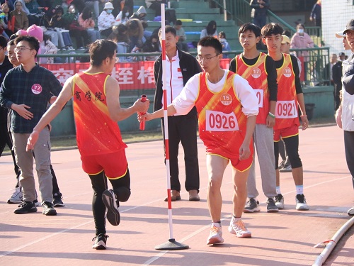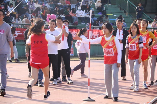 待检阅完毕,选手们一个个排队入场。待指令一下:“开始——跑!”第一棒运动员迅速迈开双腿,挥起手中的接力棒,加速往前冲!一时间,比赛场内响起一阵阵呐喊声,场面热烈而紧张。每一位运动员都竭尽全力,向着下一棒的队友狂奔。接力赛最关键的环节就是交接棒,在飞速奔跑时,稍有不慎就会失误,最终影响比赛成绩。因此,在这多达二十人的接力赛中,前后接力的运动员需要高度的配合与协作。每当要接棒的运动员伸出右手、准备起跑,前一棒运动员伸出手,将接力棒准确无误地交到接棒的运动员手中时,观众席便会响起热烈的掌声。漫长的1600米赛程,在二十名运动员的接力传递下,却又显得如此短暂。终于,接力棒传到了最后一名运动员手中,“加油!加油!加油……”,商学院看台现场气氛达到高潮。观众们屏住呼吸,凝神聚气,目光追随着那红色身影冲向终点线。最终,商院代表队取得了第三名的好成绩!