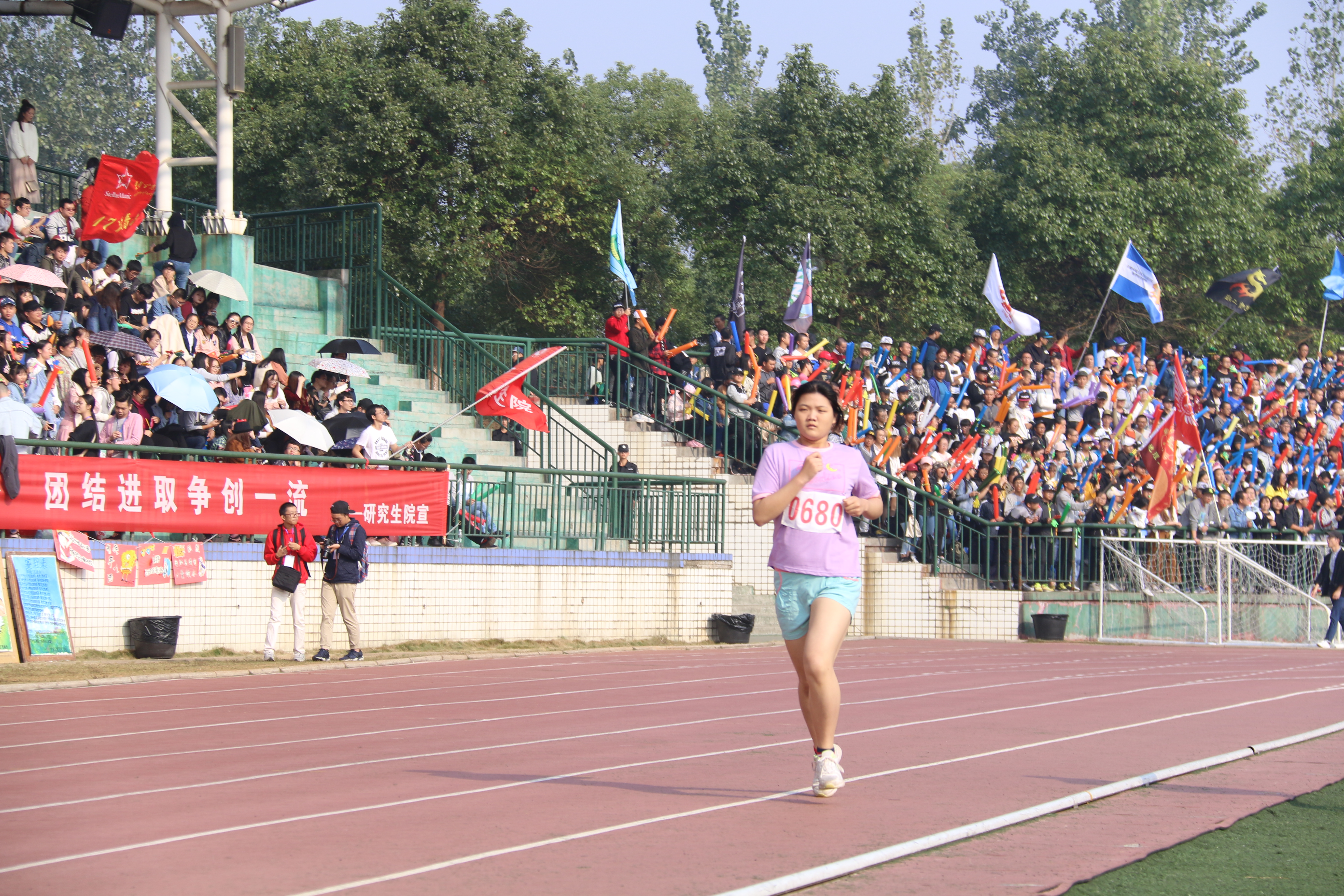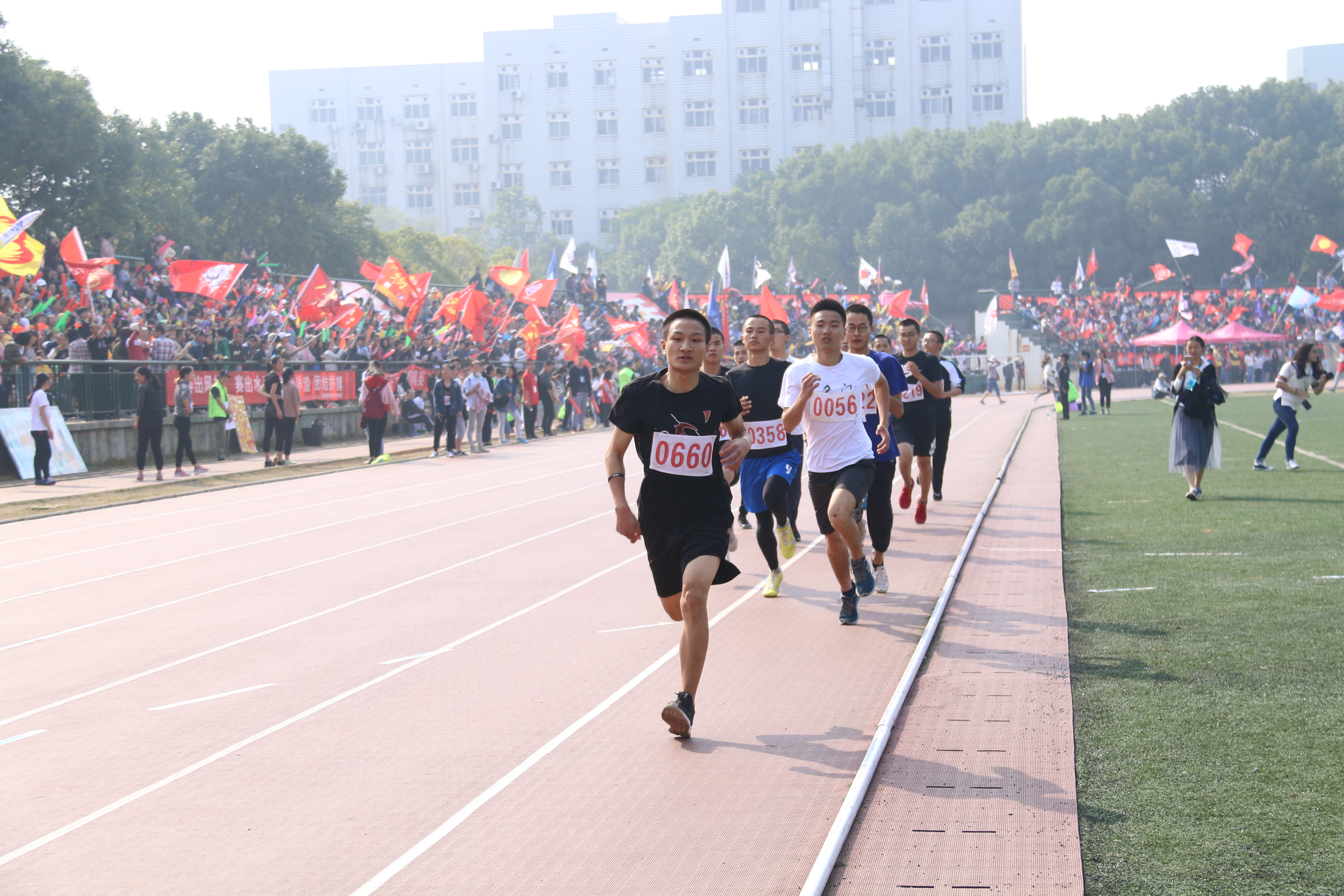 众选手如猎鹰般俯冲而出。观众台的加油声也随之热烈起来:“东风吹,战鼓擂,咱们商院怕过谁!”口哨声、加油声不绝于耳。