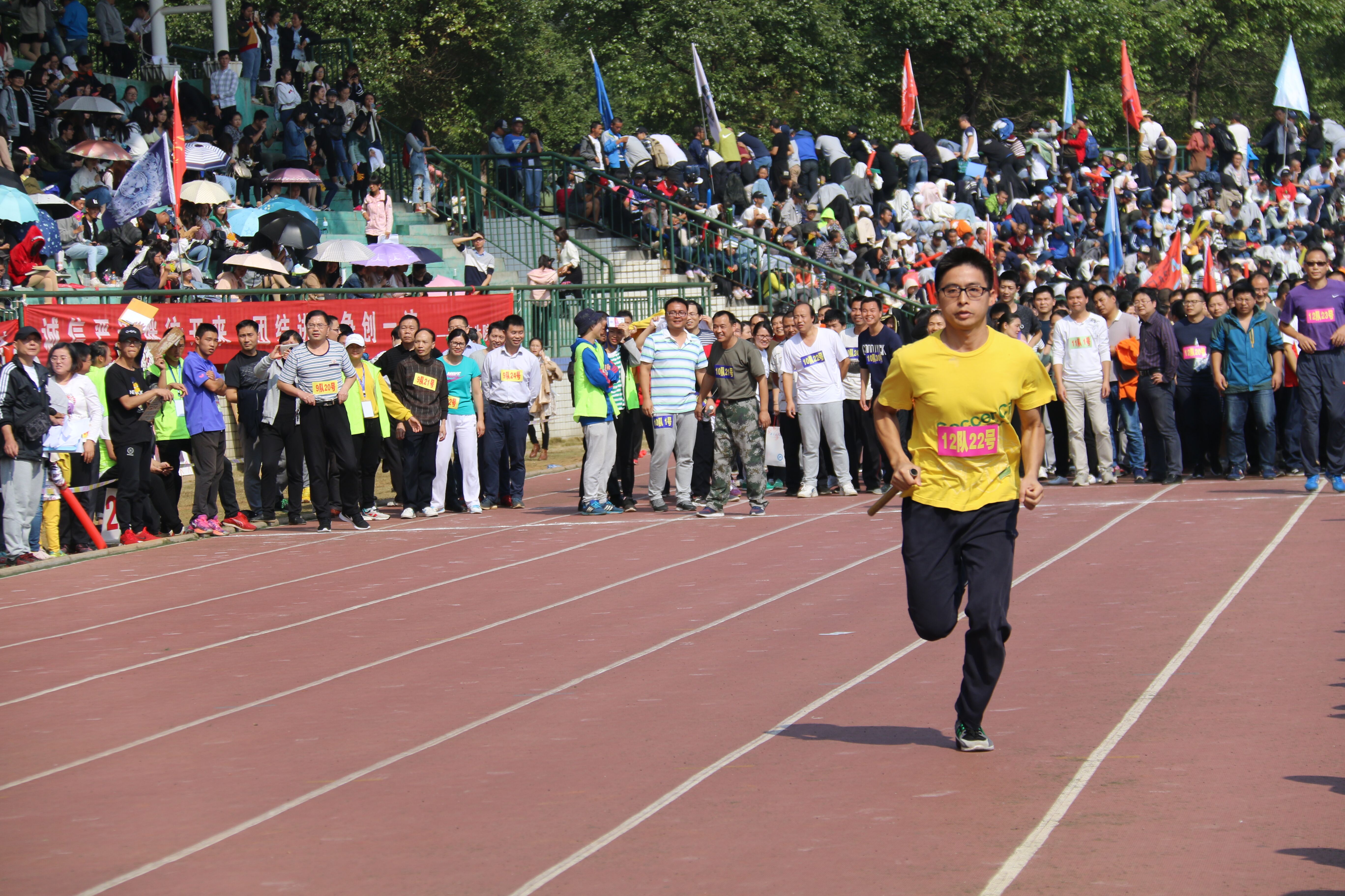 正式开始之前,湖南科技大学教职工参与的100米×30人“团结杯”接力赛已经将现场的气氛点燃,商学院30位教师代表学院参加了这次“别样”的运动会。教师们紧握接力棒,目光专注,以此来回应观众们高涨的热情。“预备——跑!”教师们奋力前行,一马当先,以领先一百米的速度夺得了第一名。