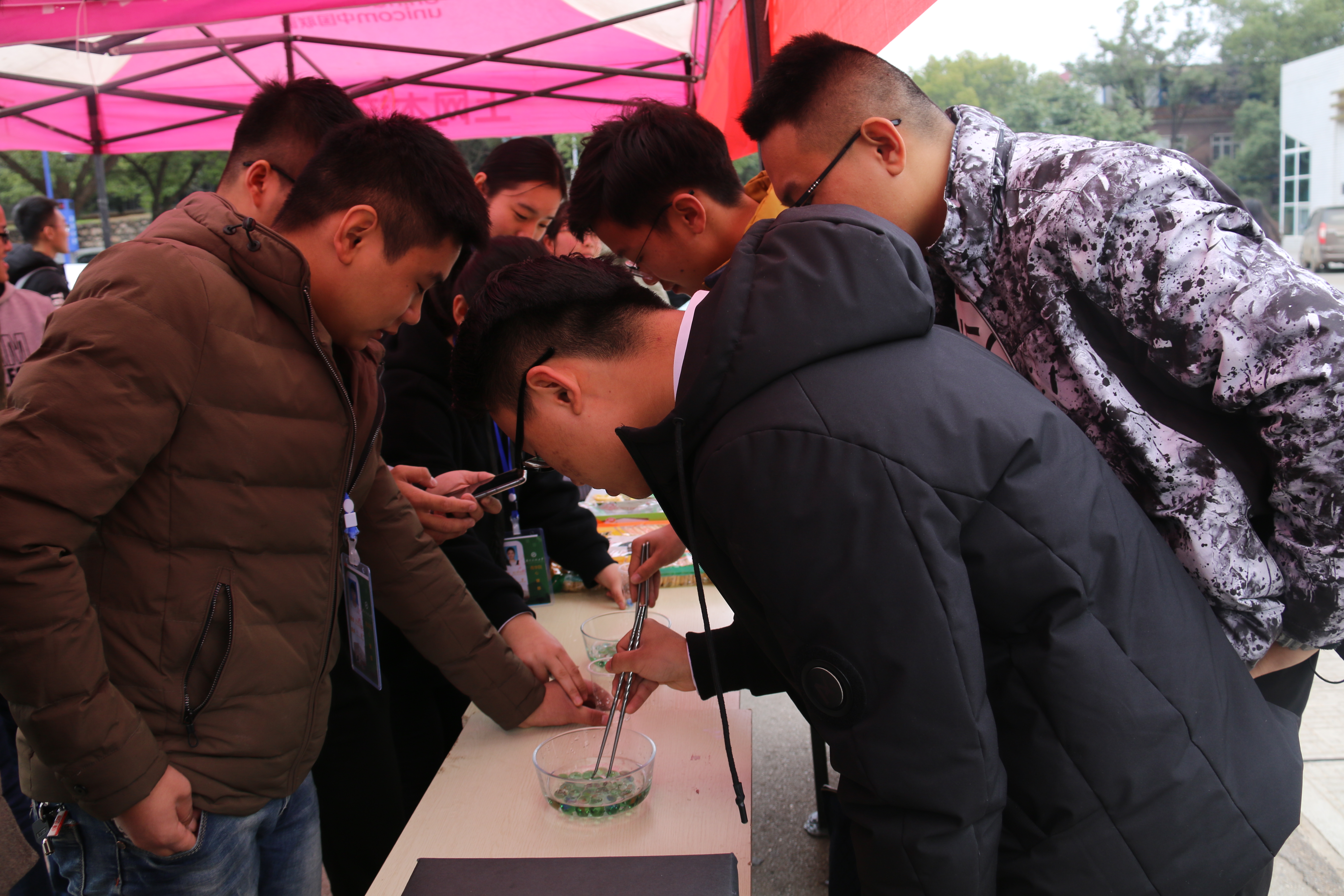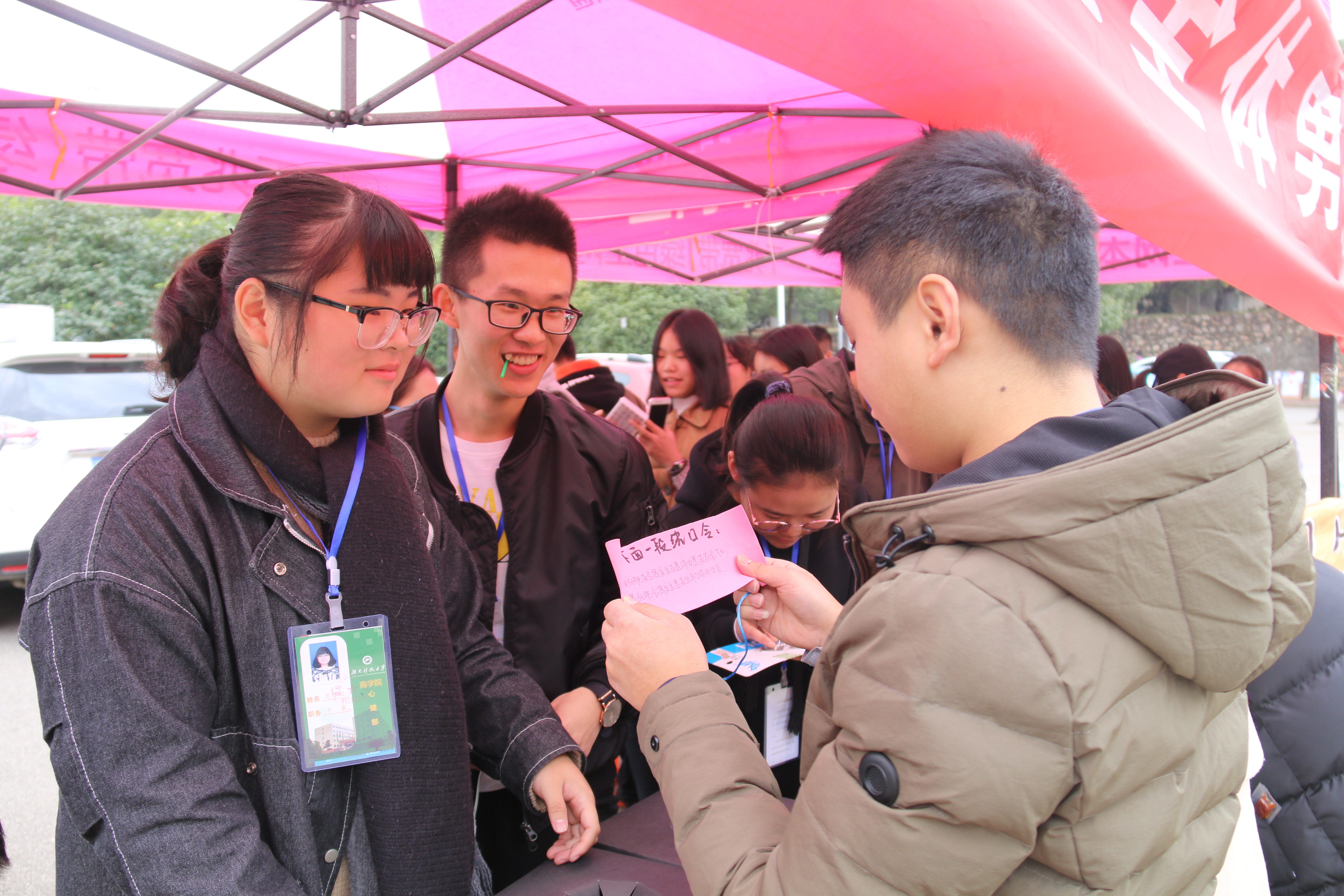 两个活动板块于当天同时进行。班级活动要求各班班团联合心理委员组织策划班级内部男生节活动,心健部将根据各班活动情况进行评比及表扬;部门摆点活动在美食广场前进行,通过“黑匣子里的秘密”、“瞄准小弹珠”、“小球,你往哪里逃?”、“心有灵犀Yes or No”以及心愿墙等游戏环节,为我院男生送去祝福。活动过程中男生们积极参与,并收到了精美礼物。