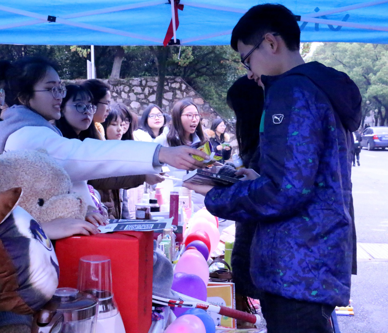 “韩正加油!我们在科大等你”——3月20日中午,湖南科技大学美食广场和八区食堂门口前鲜艳的横幅引人注目,横幅前各类书籍、玩具、小电器,还有化妆品琳琅满目,过路同学纷纷驻足,参与到这场精心筹备的义卖活动之中。本次活动由电子商务专业全体成员和商学院志愿团联合举办,义卖物品收集自商学院同学的闲置物品,通过义卖的方式为患白血病的韩正同学筹集化疗费用。