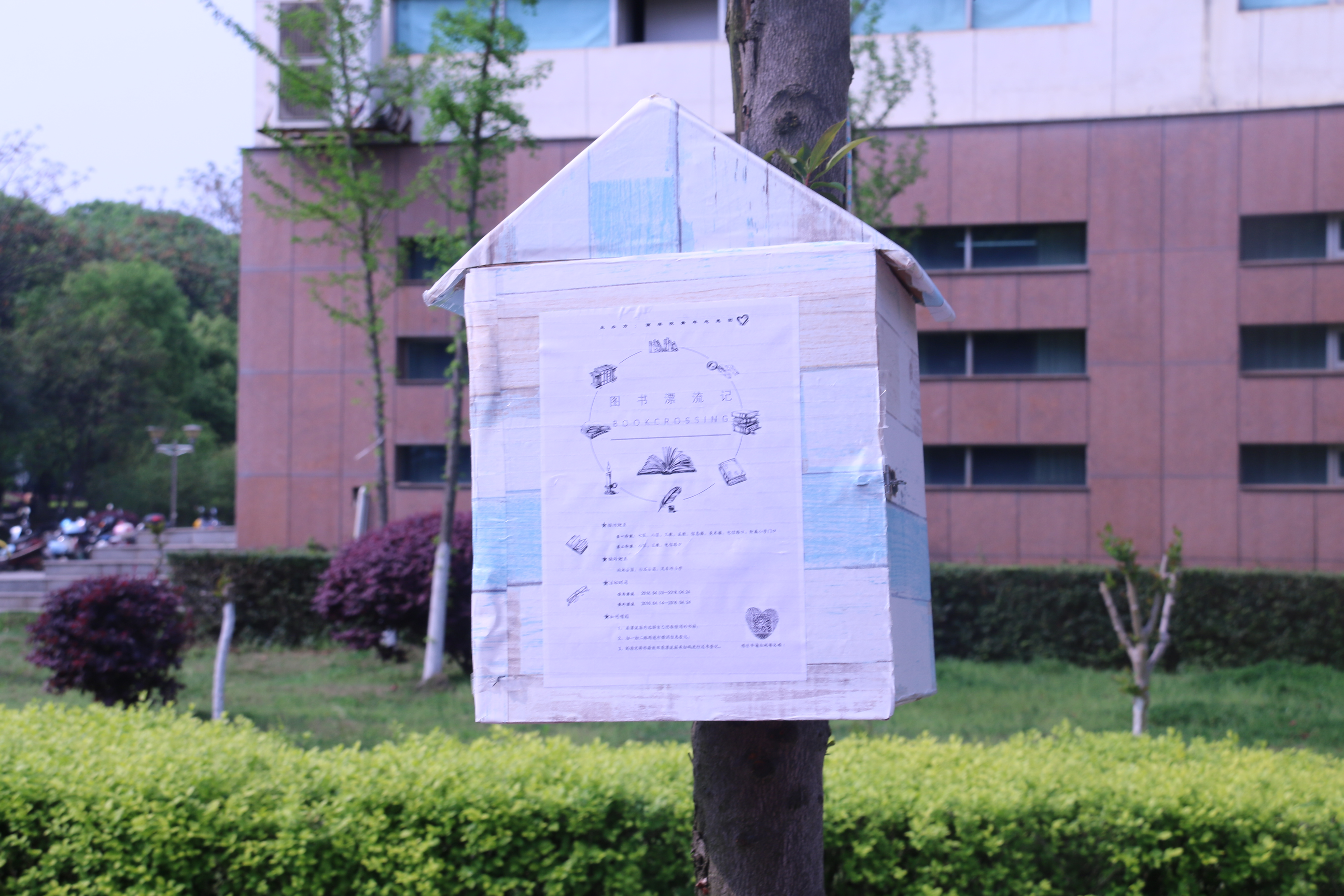2018年4月4日,湖南科技大学商学院青年志愿团策划的图书漂流活动顺利开展。校内学生公寓七区、八区、第三教学楼、第五教学楼、信息楼、美术楼、电信路口以及湖南科技大学附属小学门口出现的形似“鸟屋”的漂流箱标志着图书漂流进入校内漂流的第一阶段。