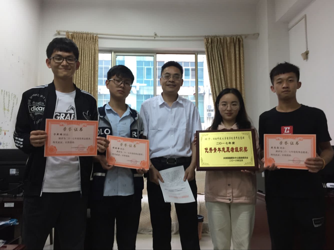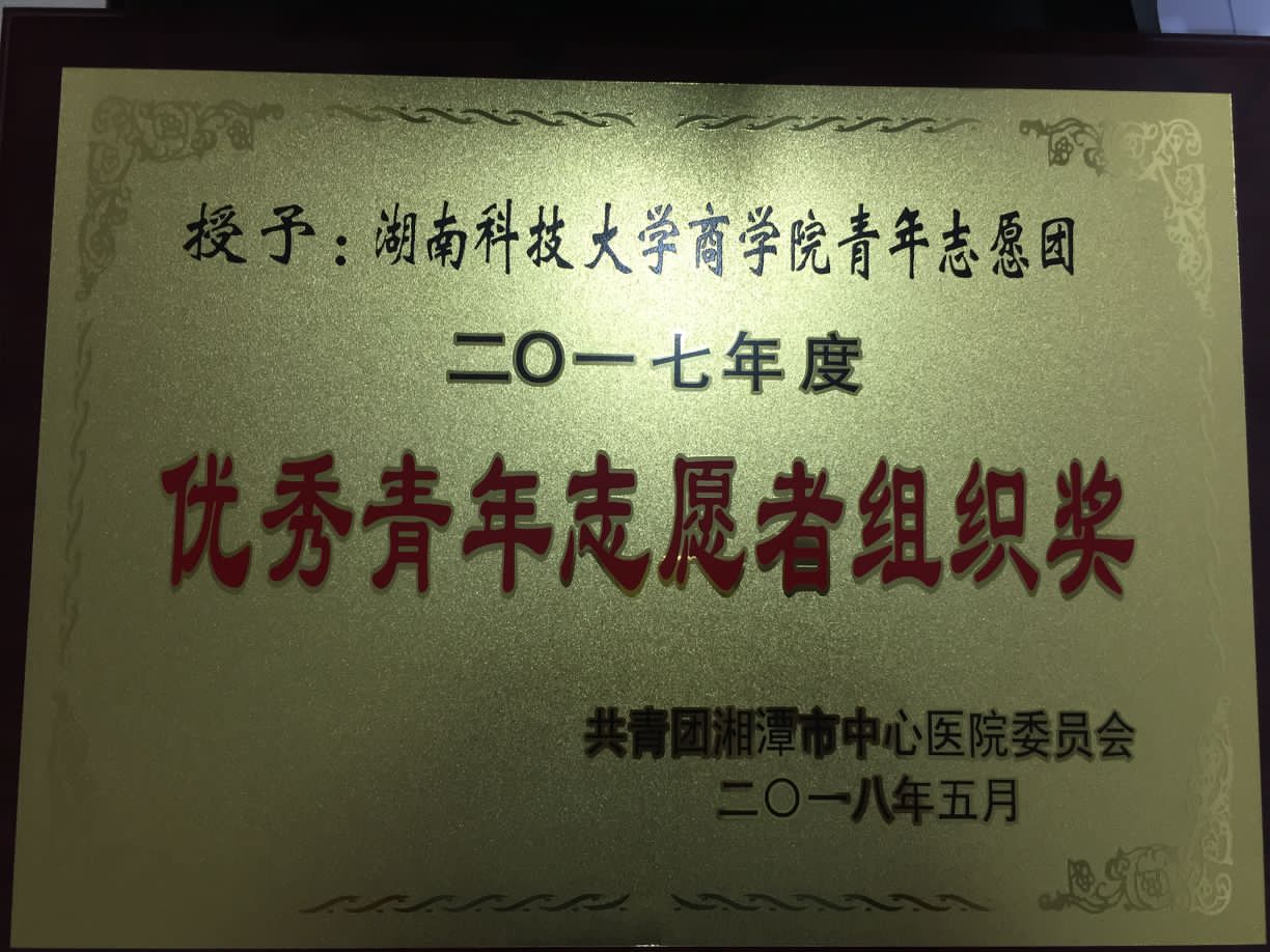 2018年5月10日,湘潭市中心医院庆“五一国际劳动节”、“五四青年节”、“五一二国际护士节”暨五四评优表彰大会上,湖南科技大学商学院青年志愿团荣获2017年度 “优秀青年志愿者组织奖”,志愿者赖忠海、彭晓静、杨金来、姚修怡、方新鹏获得 “湘潭市中心医院优秀志愿者”称号,由共青团湘潭市中心医院委员会为我院颁发荣誉证书。
