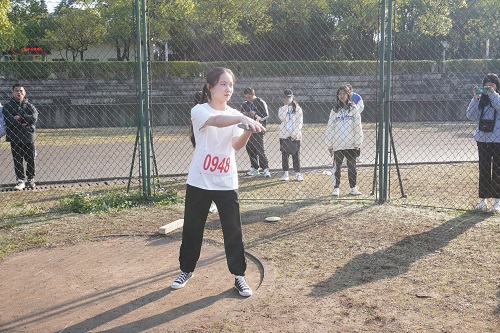 赛前,裁判向运动员说明了比赛规则以及注意事项。而后,运动员做着拉伸运动,蓄势待发。随着哨声响起,比赛正式开始,场上气氛紧张,场外加油欢呼声一片。第一位上场的商学院运动员是麦尔哈巴,她走进投掷圈,背向投掷方向,两脚开立,持饼的手臂自然下垂,身体也随着手臂反复摆动,不停地摸索着最好的发力方式。只见她凝神聚力,身体微微前倾,猛然奋力一掷,铁饼在空中划出优美的弧线后便落到了远处。她的整套动作完整到位,摆臂投掷间如行云流水,观众席传来不绝的惊呼赞叹声。在接下来的比赛中,商学院的另外几位运动员亦从容不迫、沉着冷静,各自展现出高超的投掷水平。最终,商学院三名运动员皆进入决赛,其中运动员肖蕙舒取得第三名的好成绩,麦尔哈巴、卢佩雪分别取得第七、第八的出色成绩。