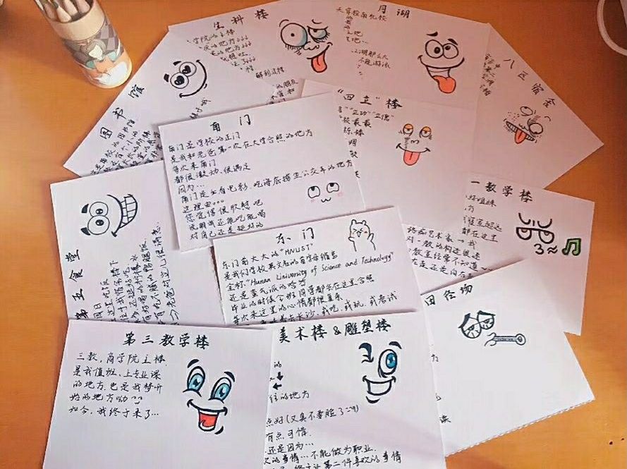 7月9日,一条创意十足的朋友圈博人眼球,配图中12张明信片记录了科大不同标志性建筑与风景的简介,附上生动的手绘小表情作为点缀,每张明信片都在相应的地点留影,宛如12位科大导游。这条朋友圈由湖南科技大学商学院17级会计2班的于思琦发出,为给远在黑龙江的母亲送上生日祝福。