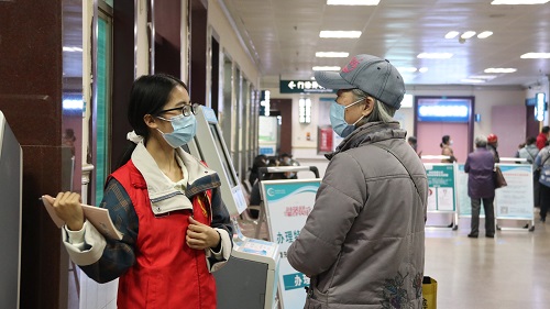 14:40,在护士的安排下,志愿者们被分配到了不同的岗位上,有的负责为患者引导科室位置,有的负责在门诊大厅维持秩序,还有的负责帮助患者及其家属操作自助服务机。在护士向志愿者们介绍了自助机器的操作流程后,志愿者们使用起来也更加得心应手,成功帮助患者们完成挂号或缴费流程。看到没戴好口罩、排队间距过近的患者,在一旁的志愿者李咪立马上前提醒。在不断的学习和实践中,志愿者们的应变能力也随之提高,能够更加从容地面对新的问题和状况。