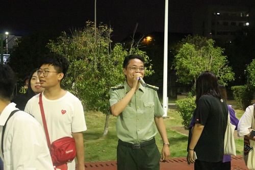 此外,商学院党委副书记傅早霞来到演出现场,亲切问候新生,新生们也热情地向书记问好。他还客串主持人,幽默地问道:“大家想不想看教官表演啊?”新生热情响应,纷纷大声喊道:“要!”最后,在学生们的热切呼唤下,教官们也上台演唱了《捉泥鳅》《小幸运》等歌曲。随着广场部分路灯逐渐熄灭,现场灯光昏暗些许,新生们打开手机闪光灯缓缓挥动,点点光亮汇集、闪亮、掠过,仿若星河流动。月色温柔,全场合唱更是使得现场多了几分温馨。
