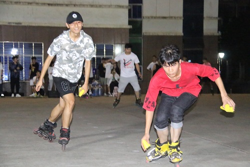 中场环节结束后,轮滑社为在场观众带来了独特的表演,其中以“轮滑跳跃”表演最为夺人眼球。期间,在轮滑社社员的引导下,一名新生与轮滑社两名社员一同躺倒在地,表演者脚踩轮滑鞋,轻盈地越过三人。整个表演舒展流畅,震人心弦。之后,教官在众人的热情邀请下,上台演唱了歌曲《祖国不会忘记》,在表演过程中,他们与新生进行积极地互动,体现出教官和学生之间真挚的情感。