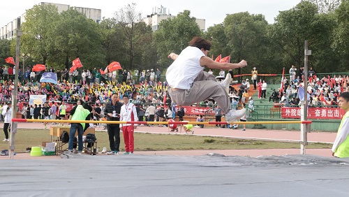 跳高比赛正在有序进行中,随着裁判员一声令下,运动员眼睛紧紧盯着横竿,右脚往后一撤,开始助跑,在离横竿约两步的地方,运动员左脚用力一蹬,身体背对横杆腾空而起。运动员伸开双臂似苍鹰展翅,高仰的头部越过横杆以后,髋部接着挺起,形成一个反弓形,双脚急速上提,继而整个人越过横竿,以肩背落垫,滚翻缓冲,轻松着地,而横竿依然静静的躺在架子上。运动员们行云流水的动作赢得观众阵阵欢呼、声声喝彩。随着横杆不断升高,难度系数在不断增加,但运动员们依旧一次次助跑、腾跃,划出一道道漂亮的弧线,不断挑战自我极限。