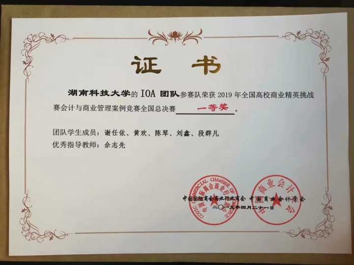 商学院2017级会计专业谢任依、黄欢、陈琴、刘鑫、段群凡组成的IOA队,历经指导老师数月的集中培训和悉心指导,以扎实的商业计划书制作水平、理性风趣的答辩风格和冷静沉着的心理素质,赢得专家评委的一致认可,并最终荣获大赛一等奖。