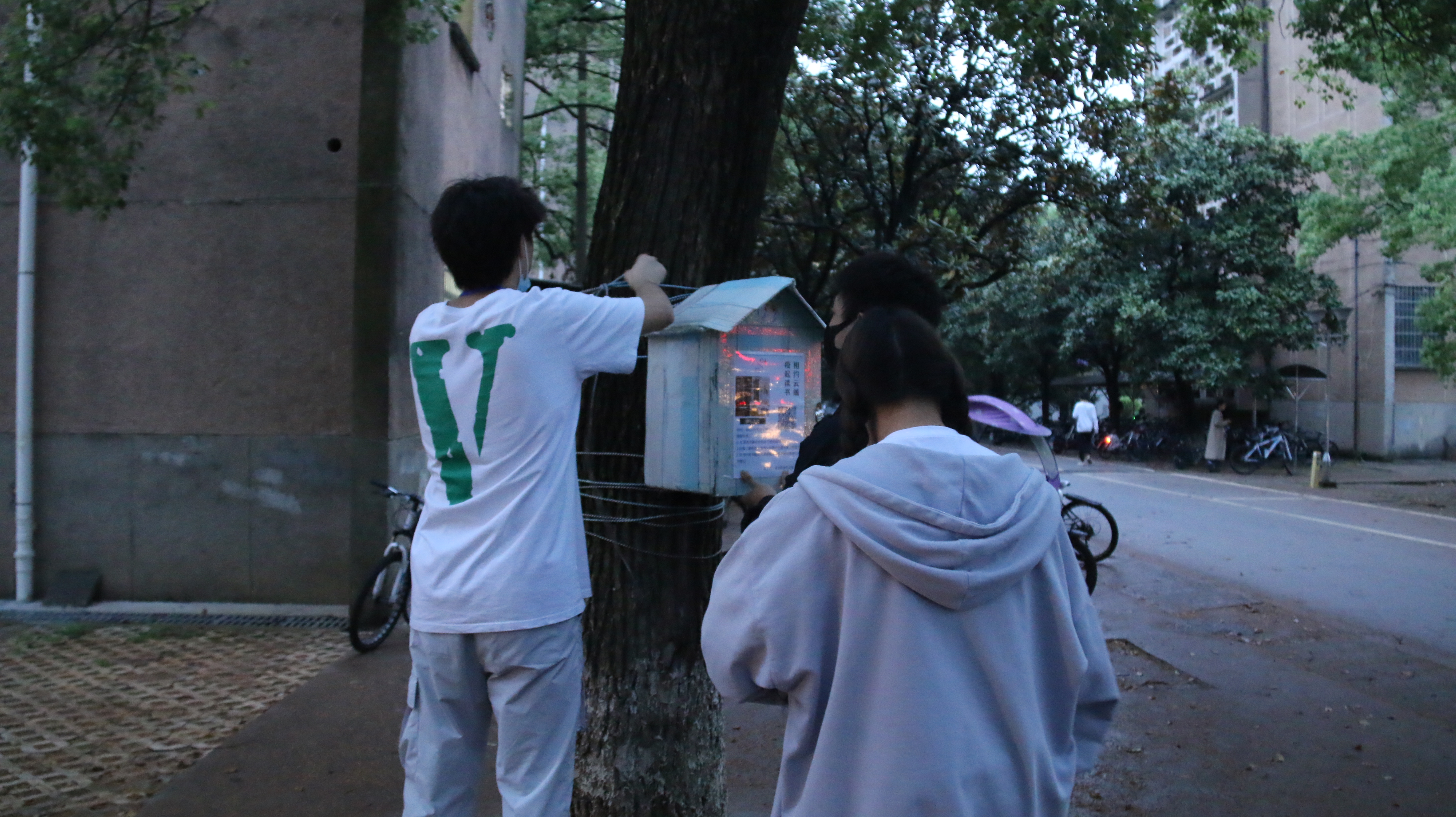 一个志愿者托着书箱,其他志愿者负责栓绳子,交叉拉紧,一圈一圈,将书箱牢牢固定在了树干上。考虑到近来多雨,志愿者们将提前准备好的遮雨布盖在书箱上,确保书箱不被雨淋,书籍不会受潮。最后,负责人将精心挑选好的书籍整齐有序地放在书箱内,并放入借阅登记表,方便来往的同学们借阅。有好几位同学驻足询问,在志愿者的指导下,有借阅意向的同学拿起手机扫二维码,轻轻打开书箱,认真挑选书籍,登记书目。拿着心爱的书籍,曾星同学细细抚摸,翻看着作者简介,嘴角微微上扬,喜悦之情溢于言表。“图书漂流活动的书都很有影响力,非常适合我们大学生阅读,我会推荐给我身边的每一个人。”曾星在采访时说道。