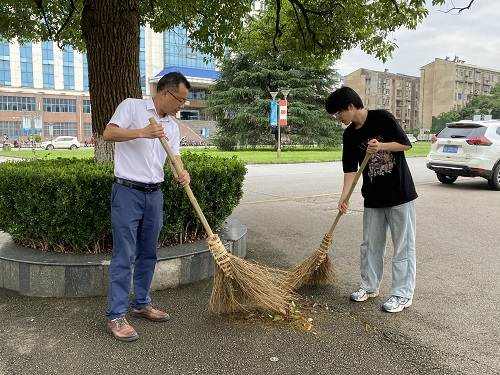 志愿者们在三教门前集合完毕,分配好劳动工具后兵分两路开展清扫活动。三教门前,志愿者们分工合作,对三教前坪以及周围草坪进行清理,台阶上的碎纸屑、垃圾箱旁的包装袋、草丛里的废弃物都没能逃过志愿者们的“火眼金睛”,他们认真清扫,干劲十足。王鹤、陈攀和刘良平也拿起扫帚加入到清扫队伍中来,全程和学生们一起劳动。