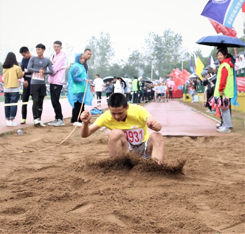 商学院第一个上场的是周泮红,他身材魁梧,体格健硕,一起跳就引人注目。他往前一扑,沙坑里顿时出现两只深深的脚印,深色的沙土被毫不留情地翻了出来!观众们都屏息凝视,双眼直勾勾盯着他的脊背,最终他不负众望,取得了令人欣喜的成绩。采访中我们得知,他参加跳远比赛是为了锻炼自己。下一次运动会,周泮红想挑战短跑100米和200米,提高自己的爆发力和速度,他打算从现在就开始准备短跑。他说:“生命在于运动,运动让我更加健康。”