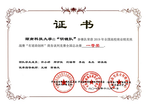 2019年11月29日-12月1日,2019年全国高校商业精英挑战赛“有道商创杯”商务谈判竞赛全国总决赛在山西农业大学信息学院。我校由商学院国贸、电商、经济及潇湘学院商学系工商管理等专业同学组成的月湖队(向景宇、夏敏航、陈杨、肖德清、罗语婧、吴谭)和明镜队(许小婷、郑亦佳、刘锡苓、李彪、朱杰、钟美琪)参加比赛,经过多轮拼搏,两支参赛队均荣获全国总决赛一等奖,其中月湖队队长向景宇同学还夺得了全国总决赛唯一的“最佳谈判手”荣誉称号,指导老师王琼和贺曲夫均被评为“优秀指导老师”。