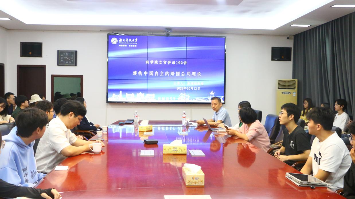 10日13日上午,湖南科技大学商学院湘江高端暨立言讲坛192讲于第三教学楼301会议室举行。中国人民大学商学院院长易靖韬受邀作了题为“建构中国自主的跨国公司理论”的相关报告。讲坛由商学院副院长戴魁早主持,学院部分老师及在读硕博士生与会。