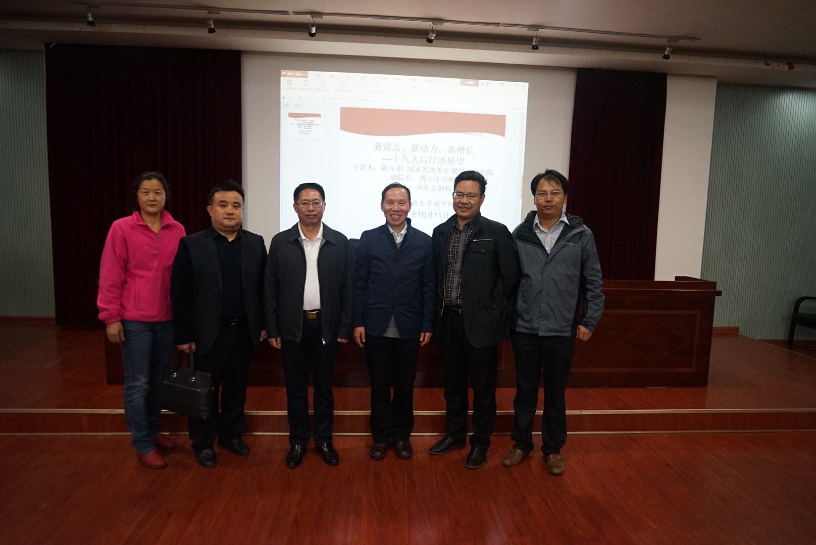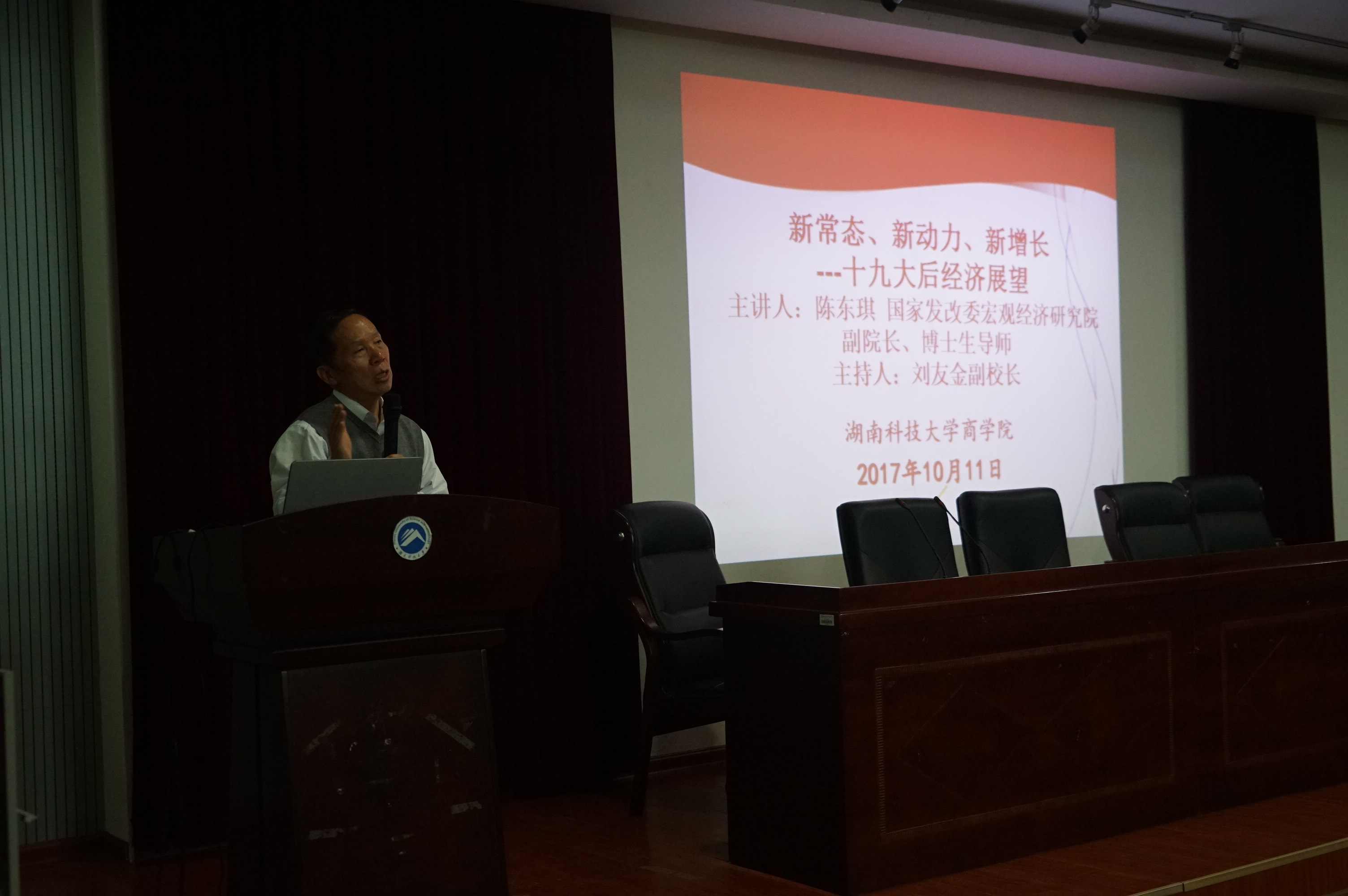 10月11日晚七点半,由国家发改委宏观经济研究院陈东琪教授主讲的“新常态,新动力,新增长——十九大后经济展望”学术讲座在三教101准时开始。会议由刘友金副校长主持,校社科处处长向国成教授,商学院潘爱民书记、贺胜兵副院长、颜剩勇副院长及多位老师参与了讲座。